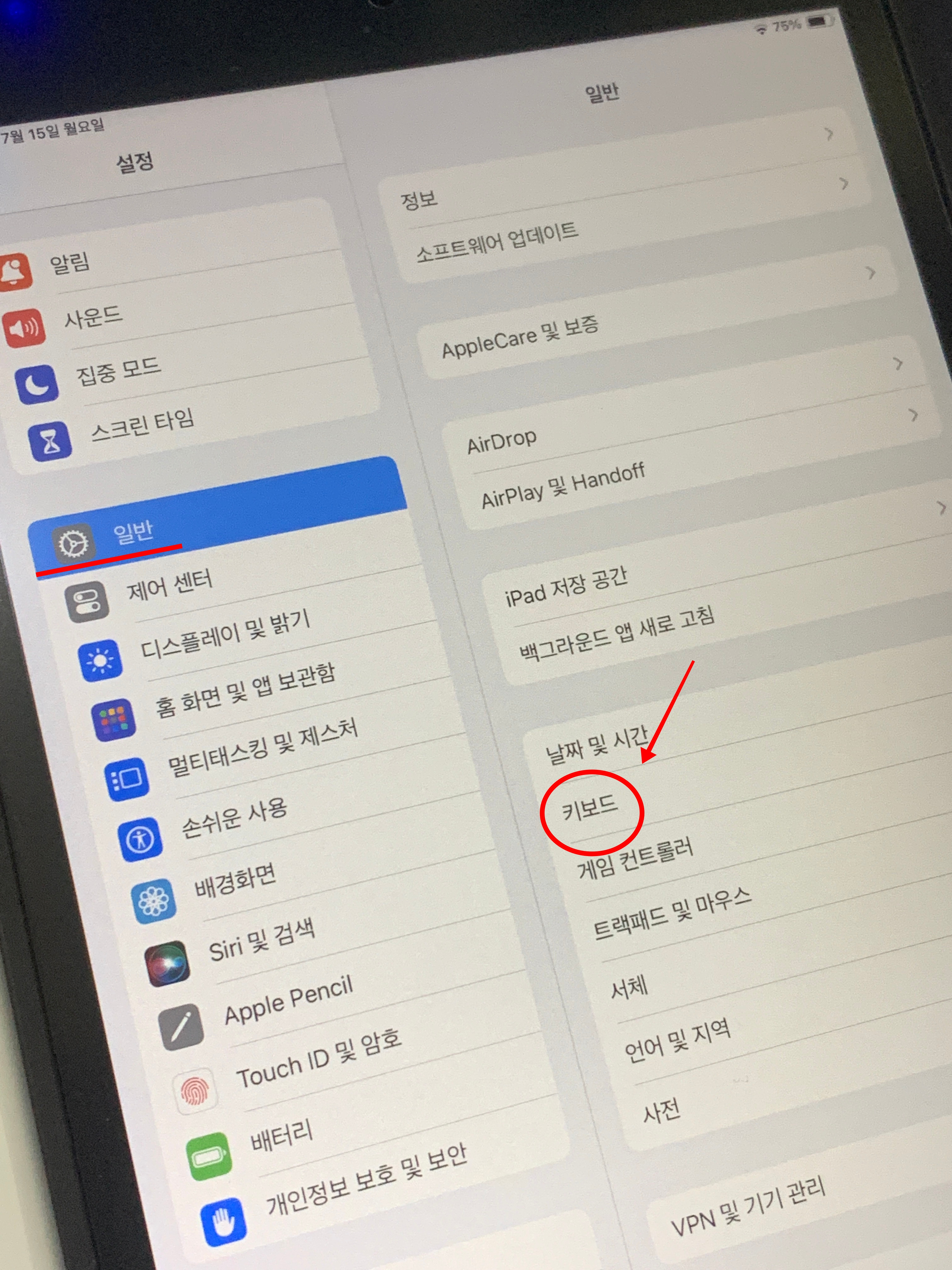 1. 유니버설 컨트롤이 설정된 상태에서 아이패드의 설정 - 일반 - 키보드 탭으로 들어갑니다.