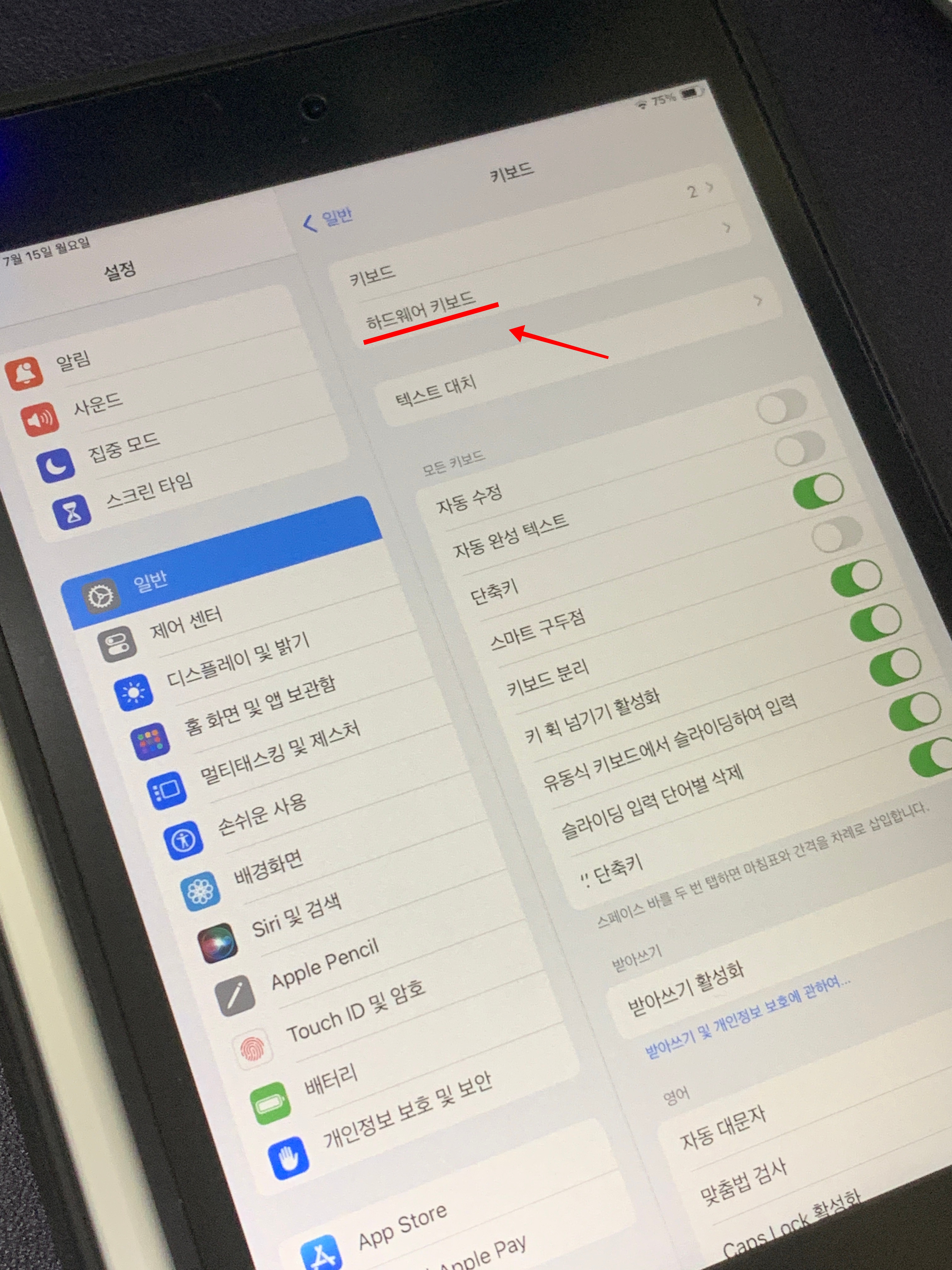 2. 키보드 설정에서 하드웨어 키보드로 들어갑니다. 만약 유니버설 컨트롤를 연결했음에도 하드웨어 키보드가 보이지 않는 경우가 있는데요. 이때는 아이패드에서 글자를 쓰게 되면 하드웨어 키보드가 나오게 되니 참고하시길 바랍니다.