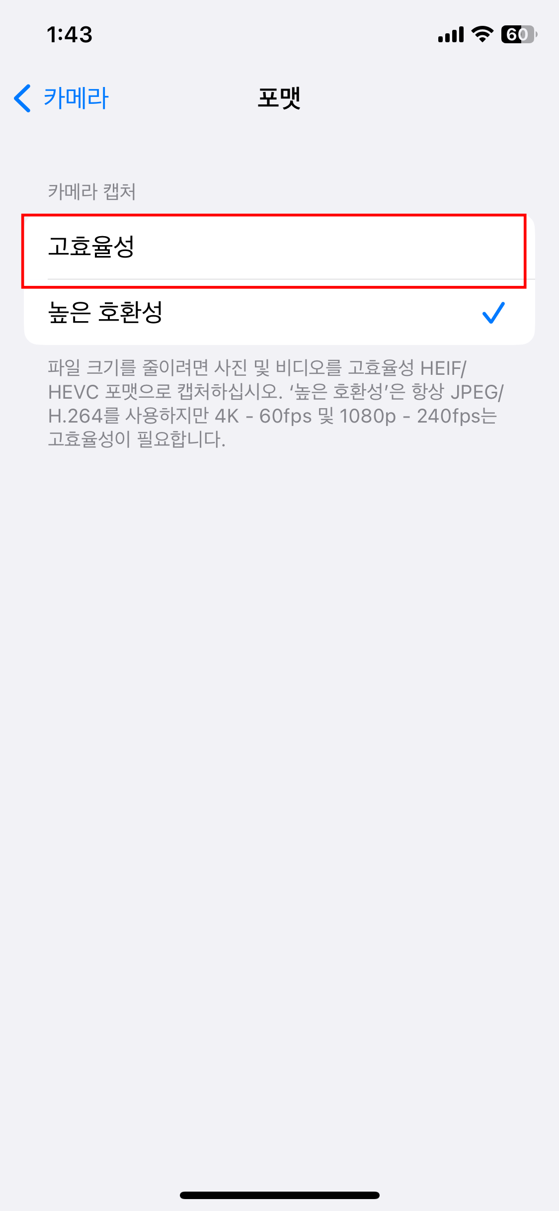 두번째 추천하는 방법은 사진 포맷 형식을 바꾸는 것입니다. 보통 사진 포맷 파일 형식을 생각한다면 JPG, PNG를 생각하실텐데요. 아이폰에서는 사진 파일 포맷 형식을 HEIF/HEVC로 바꾸면 애플기기간의 효율성은 정말 좋습니다. 그리고 용량은 JPG 대비 엄청나게 작아지게 됩니다. 그렇게되면 정말 아이폰의 사진을 많이 찍더라도 효율적으로 관리 할 수 있습니다. 다만 원본 HEVC 파일은 다른 기기에서 인식이 어려울 수 있습니다. 보통 다른 사람에게 사진을 보낼 때는 카톡으로 보내면 JPG로 보내지니 그렇게 이용하면 불편함은 없습니다.
