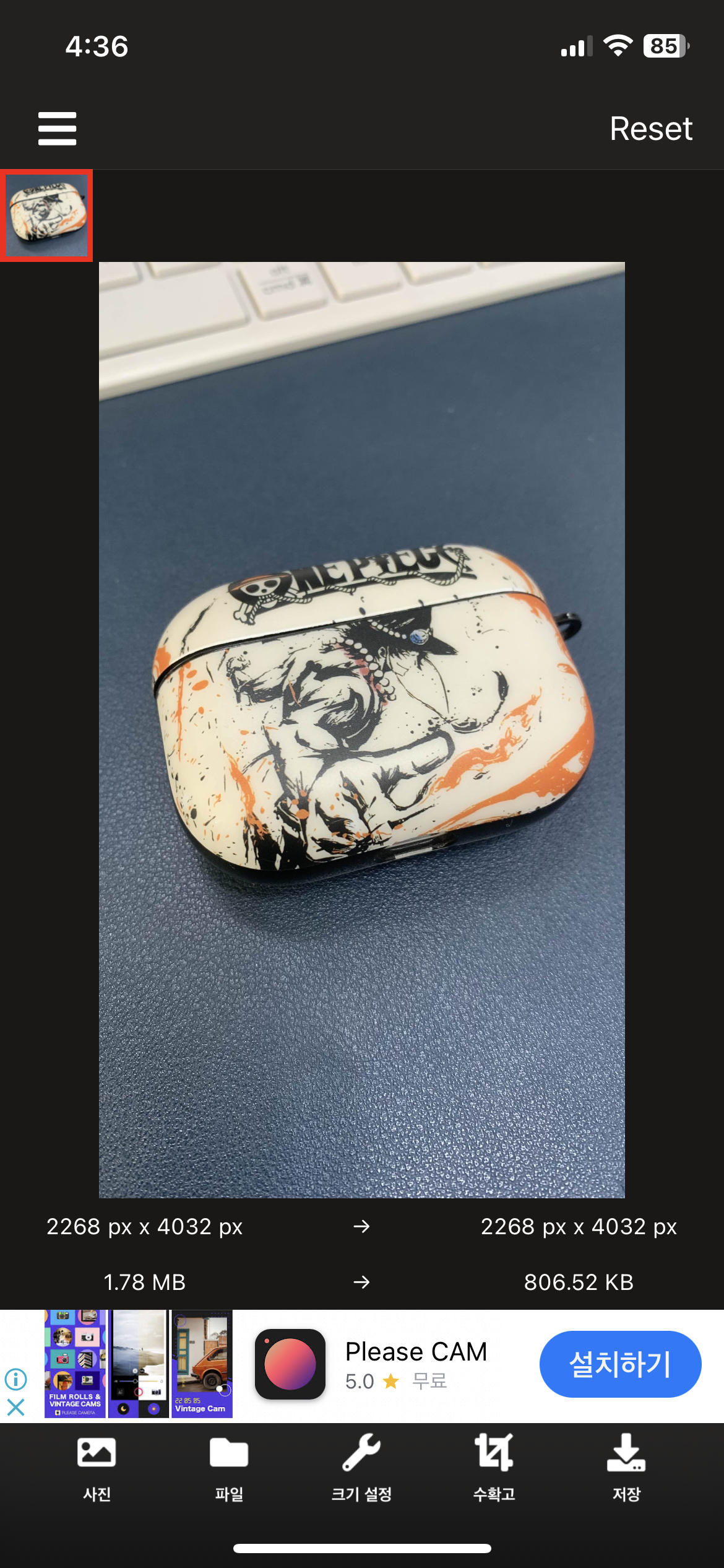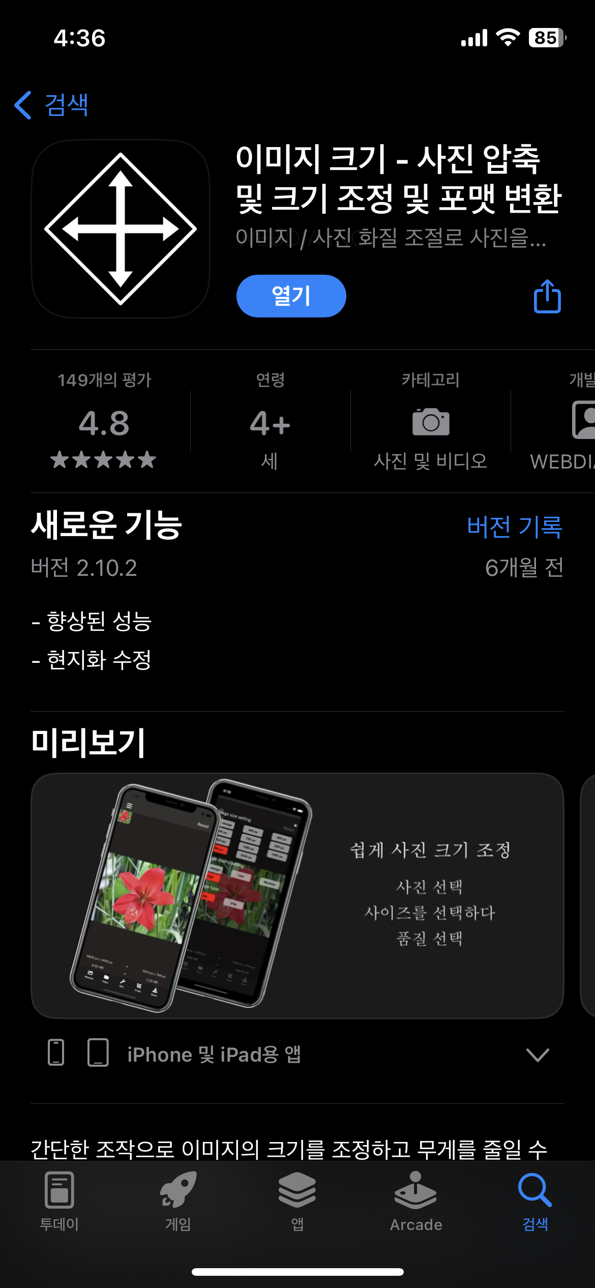 세번째 추천방법은 어플을 이용하는 것인데요. 가장 추천하는 어플은 이미지 크기라는 어플입니다. 이미지 크기로 검색하면 여러가지가 나오기 때문에 제가 추천하는 어플의 다운로드 링크는 아래 첨부하겠습니다. 방법은 정말 간단합니다. 원하는 사진을 선택한 다음 사이즈, 화질, 포맷 3가지를 내가 원하는대로 맞출 수 있으며 아래에 크기가 얼마로 변환이 되는지 확인이 가능합니다.