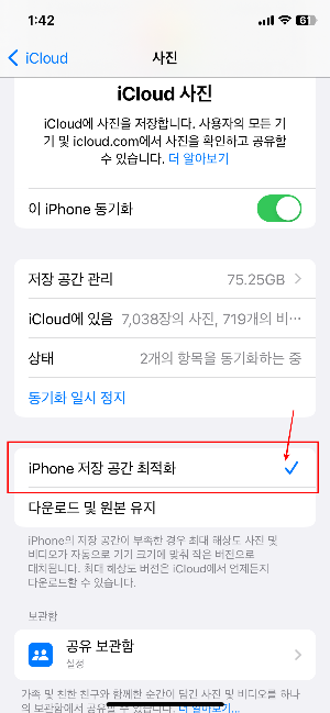 설정 - iCloud 설정 - iCloud - 사진 - iPhone 저장 공간 최적화