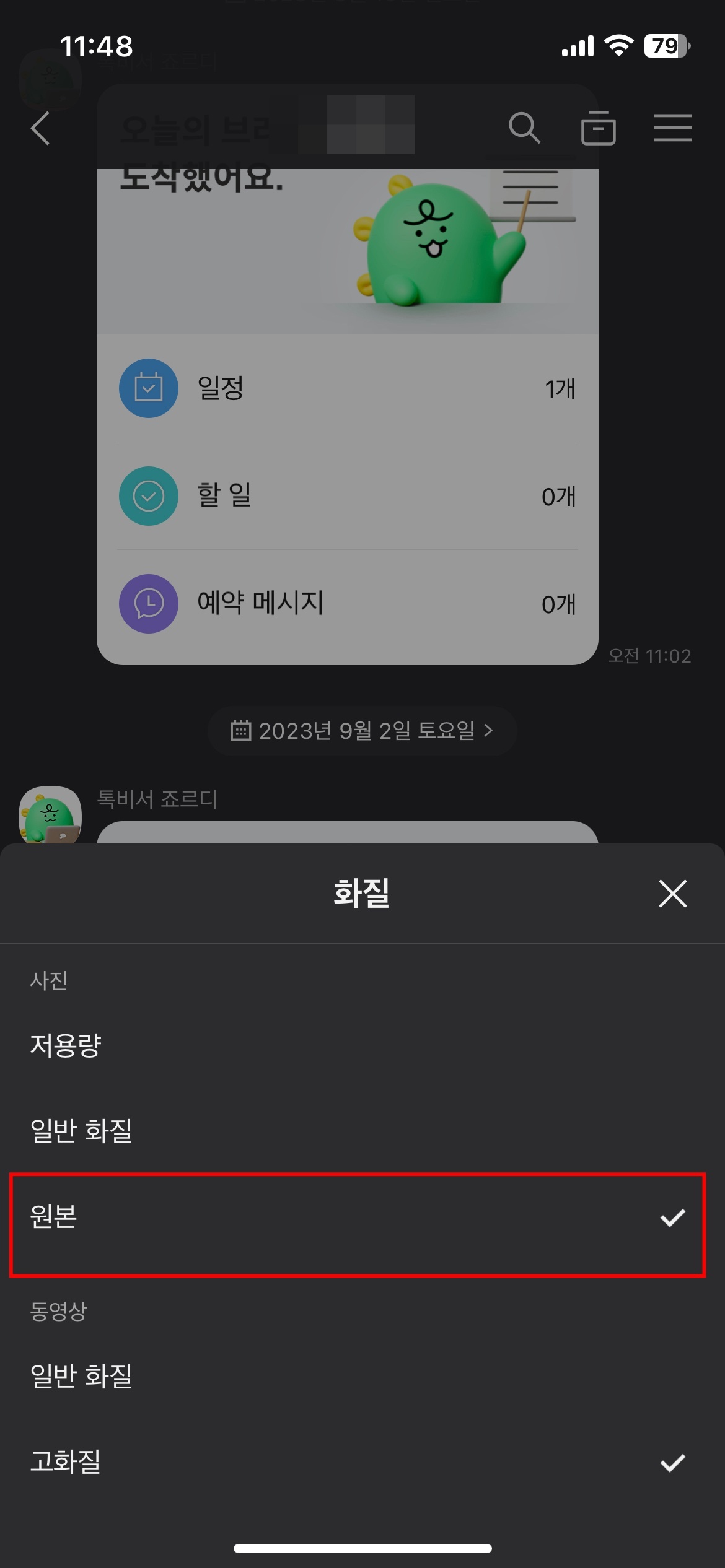 전송할때 꼭 화질을 선택해서 원본, 일반 화질, 저화질 등 상황에 맞게 전송을 해야합니다. 화질이 나쁘지 않게 전송을 하기 위해서는 원본을 선택해서 전송하는 것을 추천 드리겠습니다.