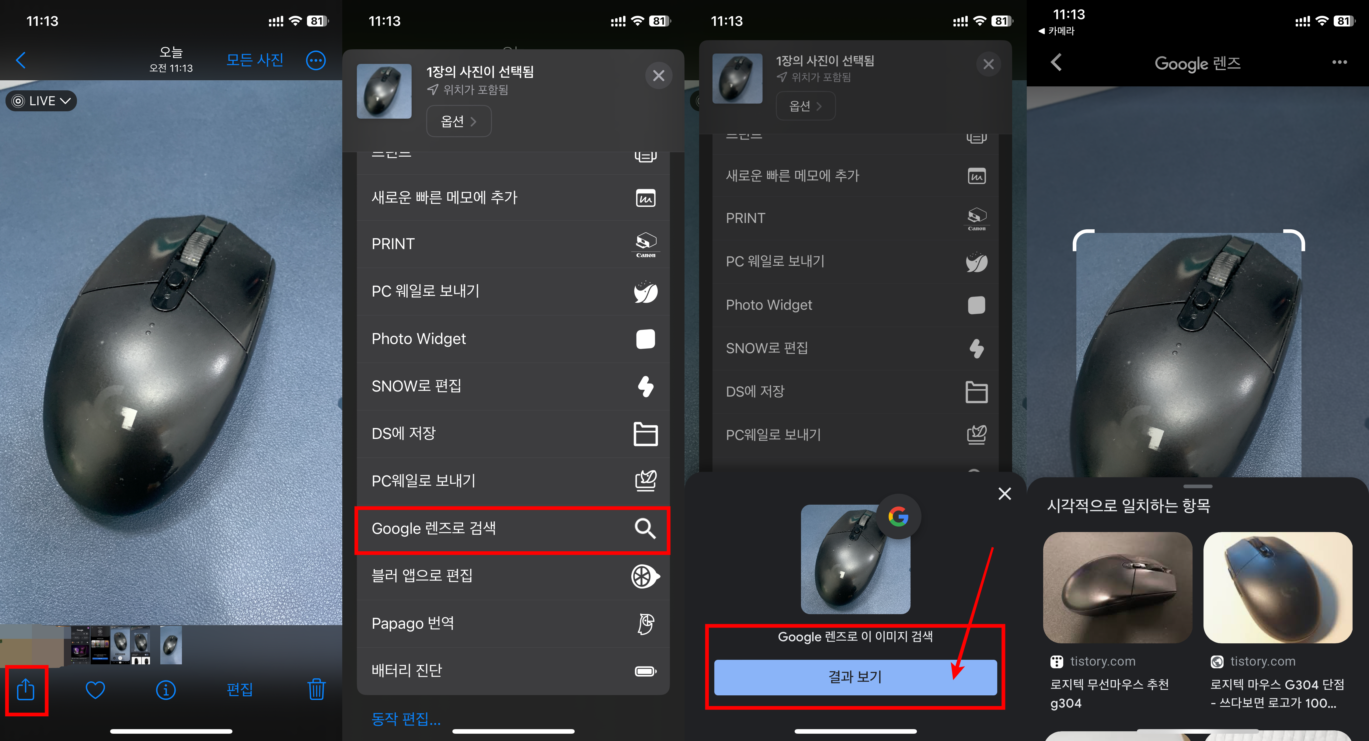 테스트로 사용하는 로지텍G304를 한번 가져다 대보았는데요. 바로 아래 검색 결과가 나오는 것을 확인할 수 있었습니다. 갤러리로도 검색이 가능합니다.