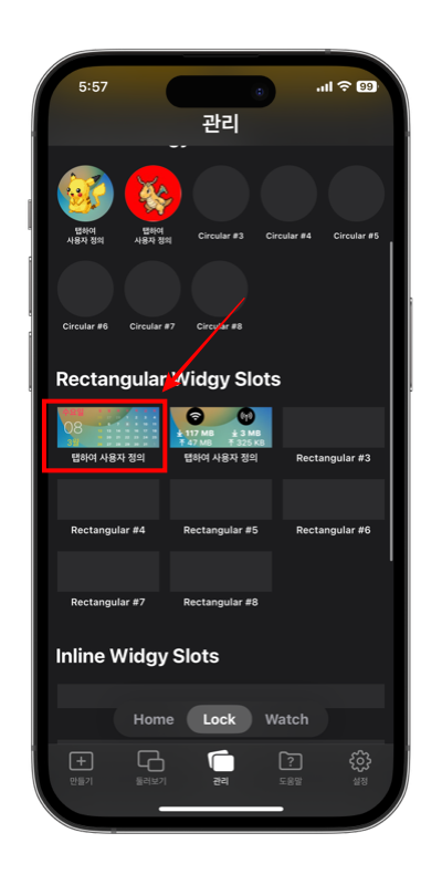 가져오기를 누르면 일단 위젯 슬롯에 넣을 수 있게 됩니다. 이제 위젯 슬롯에 등록을 해야하는데요. 관리에서 Lock 탭에 들어가서 Rectangular Widget Slots에서 원하는 #1, #2 아무곳에나 넣으셔도 됩니다. 그런데 #1에 넣는 것을 추천드립니다.
