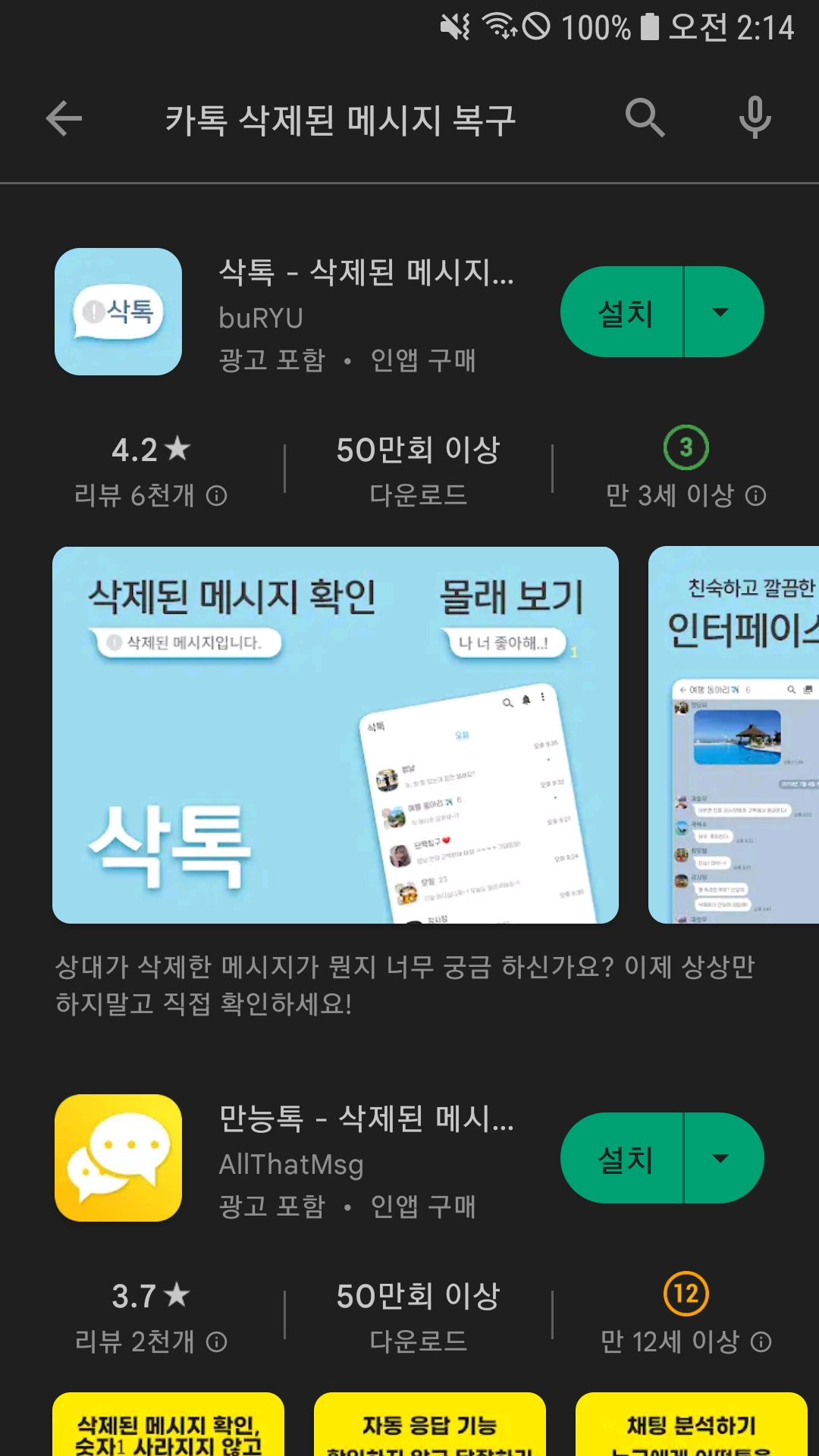 위에서 정리했다시피 삭제된 메세지를 볼 수 없는 상황은 5분이 지나기전에 삭제를 한 상황입니다. 그렇게 삭제를 하게 되면 삭제된 메세지가 남게 되는데 이 메세지가 무엇인지 너무 궁금할 수 밖에 없습니다. 이때 안드로이드 스마트폰을 사용하는 분들은 복구가 가능합니다. 구글 플레이 스토어에서 카톡 삭제된 메세지 복구라고만 치면 삭제된 메세지를 복구할 수 있는 어플들이 나오게 됩니다. 이런 어플을 이용하면 삭제된 메세지를 확인할 수 있게 되는 것입니다.