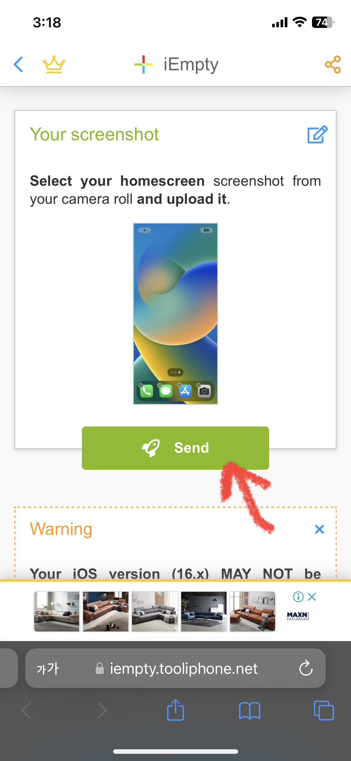 4. 위 iEmpty 홈페이지에 들어가서 Choose File을 눌러 캡쳐한 파일을 업로드 합니다. 이제 Send를 눌러 파일을 아이콘을 만듭니다.