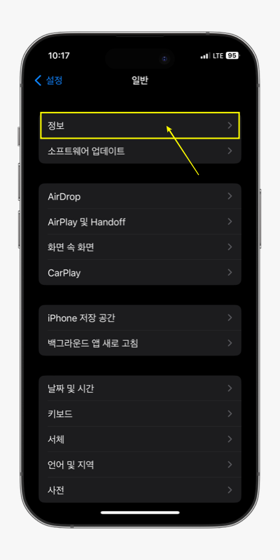 1. 설정 -  일반 - 정보로 들어갑니다.