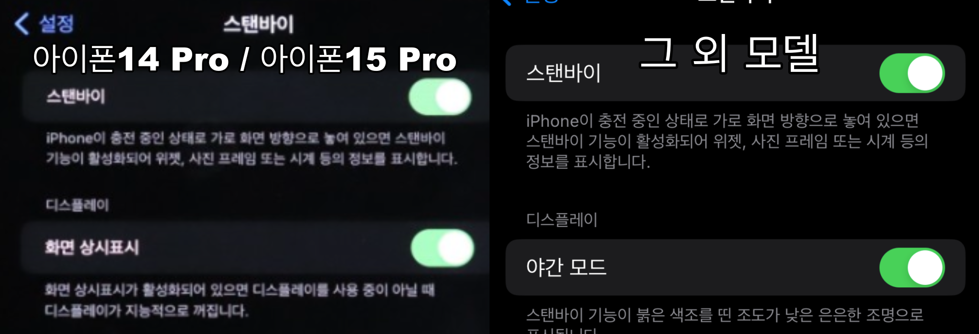 위 화면은 아이폰14 Pro, 아이폰15 Pro의 스탠바이 설정화면과 그 외 모델의 스탠바이 설정화면입니다. 다른점을 보시면 아이폰14 Pro, 15 Pro는 화면 상시표시 설정이 있는데에 반해 그외 모델은 상시화면 표시 설정없고 바로 야간모드 설정만 있습니다.
