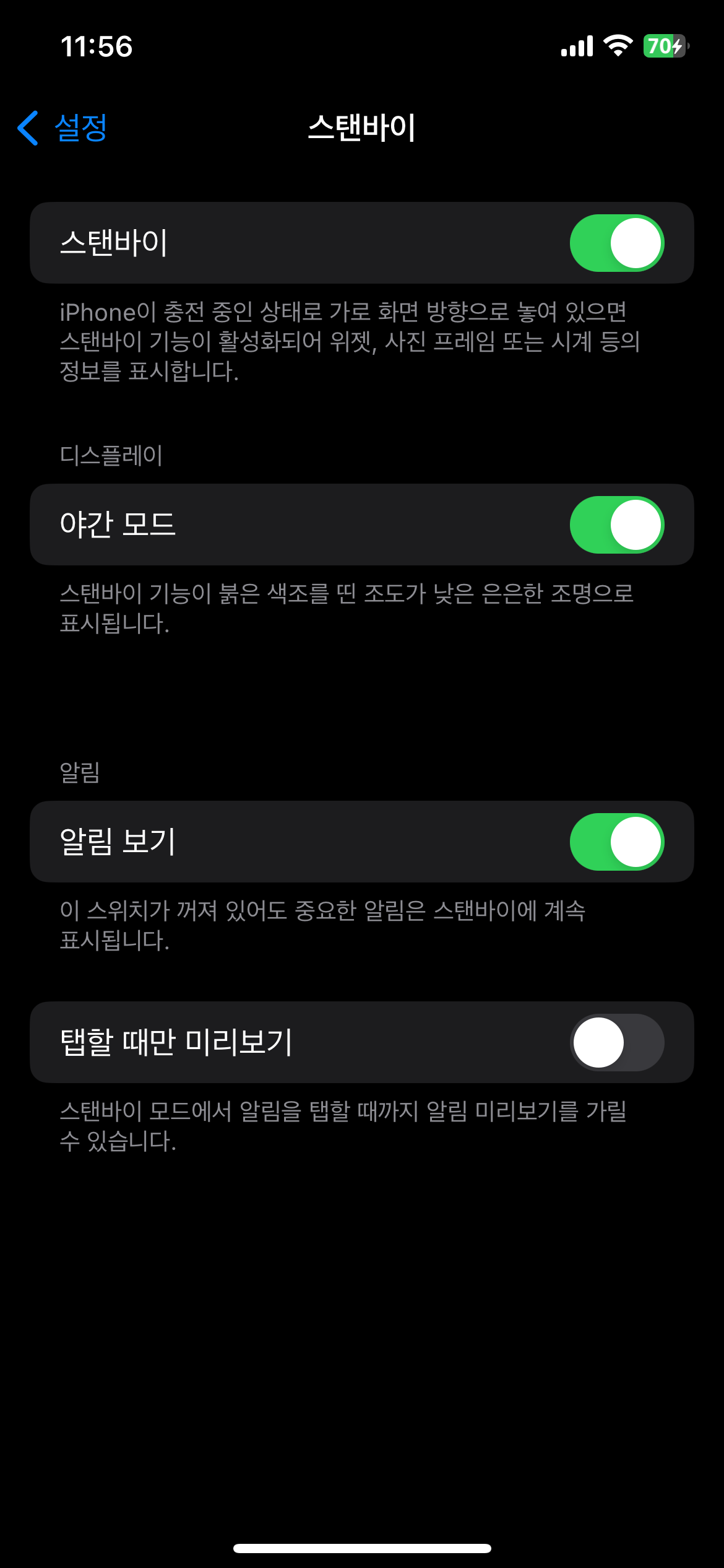 즉 AOD 설정이 없는 아이폰14 Pro, 아이폰15 Pro 모델만 상시화면이 가능하고 나머지는 불가합니다. 먼가 움직임이 있을 때 화면이 나오는 것이 아니라 터치나 흔들렸을 때만 화면이 나오는 것은 조금 아쉬운 부분일 수 밖에 없는데요. 번인을 막기 위함이지만 화면을 조금씩 움직인다거나 하는 방법으로 번인을 막으면서 스탠바이의 설정을 좀 더 실용성 있게 추후 업데이트가 되면 좋겠습니다.
