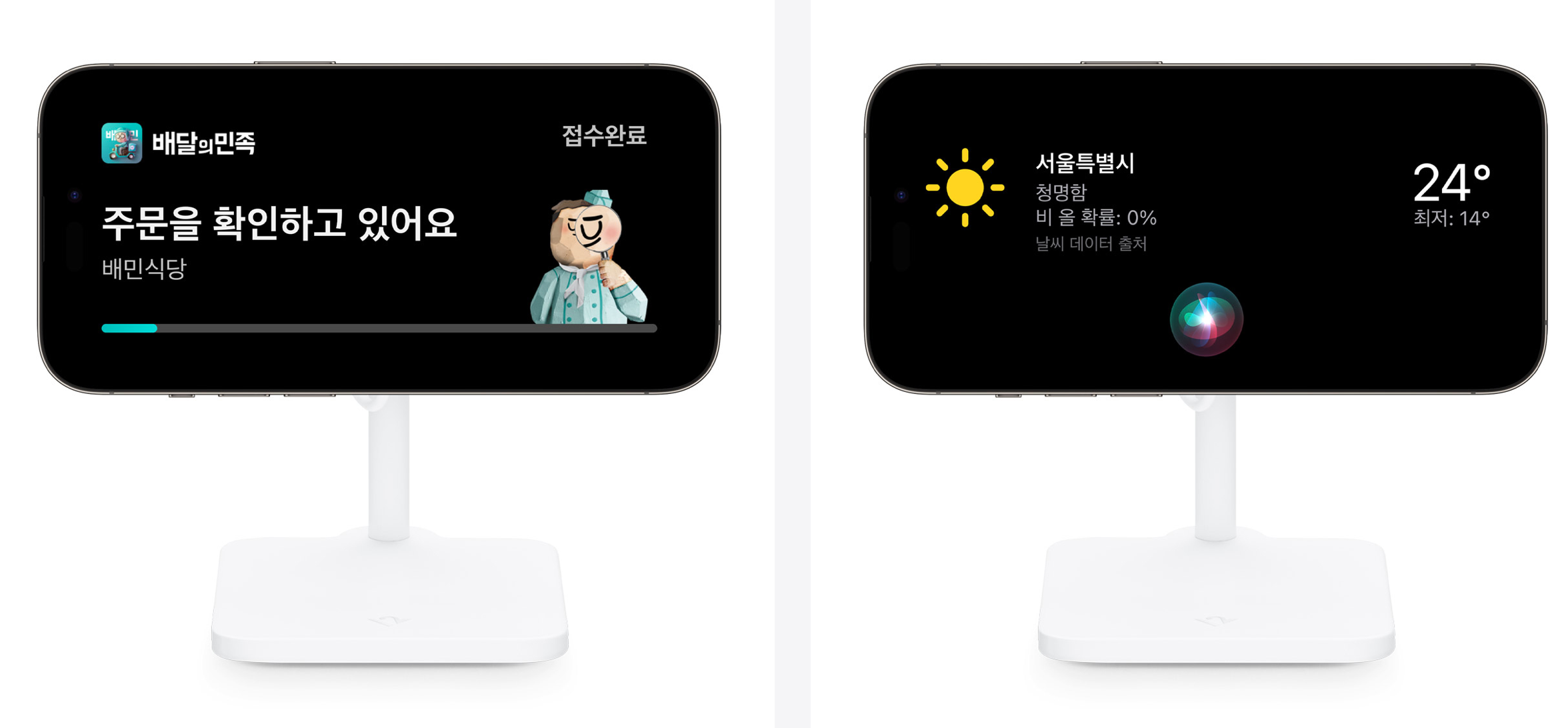 스탠바이란 충전중인 아이폰에 다양한 정보를 띄워주는 것으로 간단한 시간정보는 기본이고 배달상황이나 내가 좋아하는 팀의 경기결과 날씨 정보 달력등의 다양한 정보를 충전을 하면서 새로운 기기로 사용하는 느낌을 줄 수 있습니다.