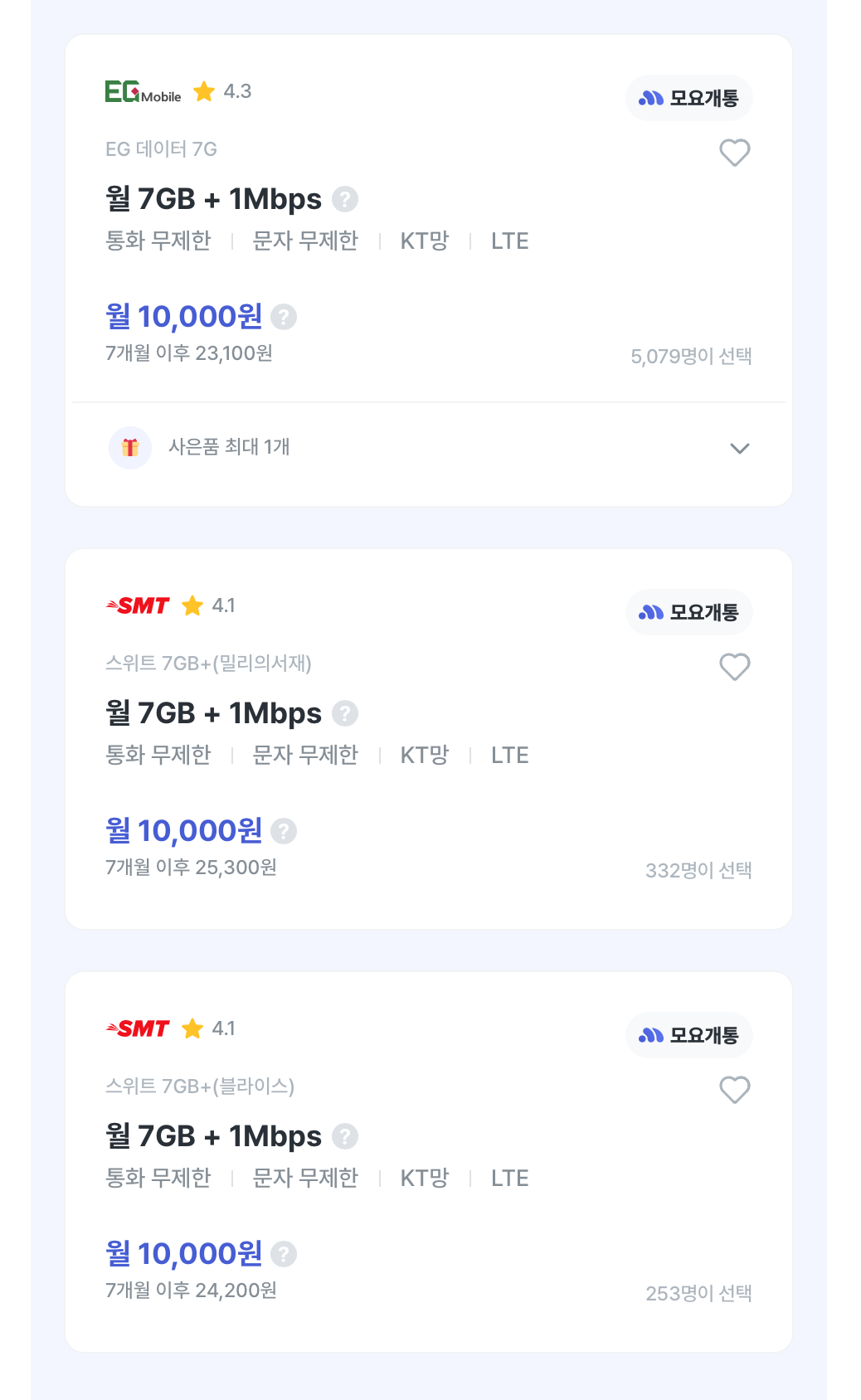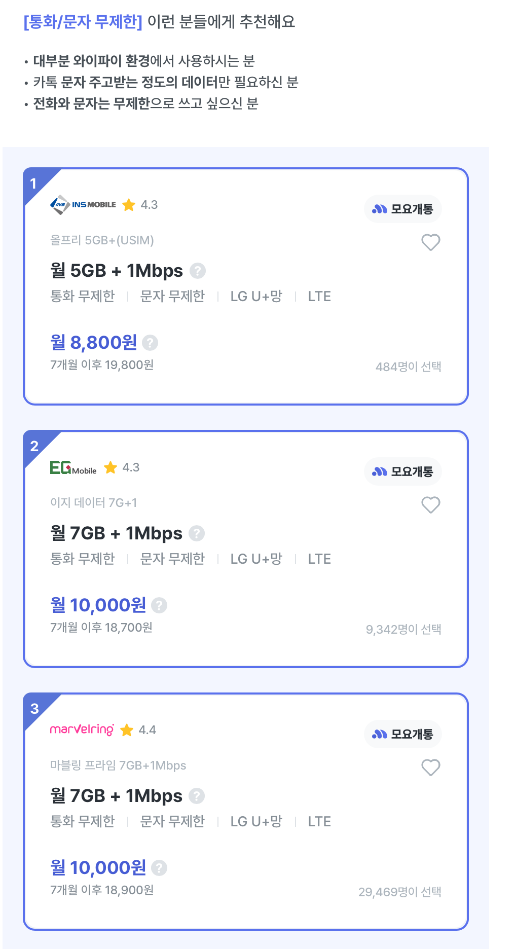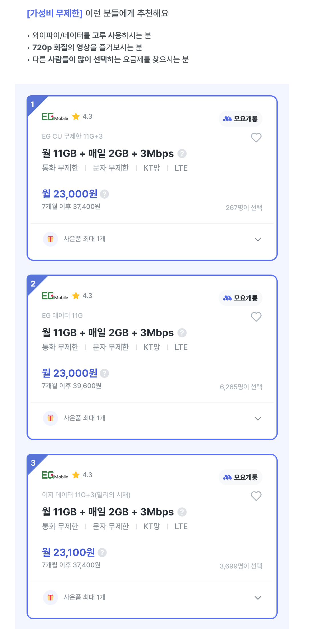 위에 알려드리는 가성비 요금제를 잘 살펴보시고 합리적인 요금제를 선태개해 보시길 바랍니다.