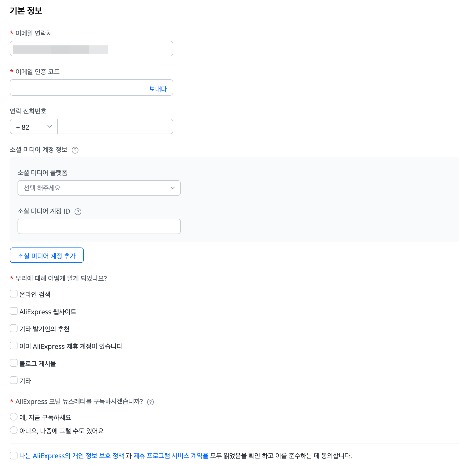 등록을 하기 위해서는 이메일과 연락처가 필요합니다. 앞에 별표가 있는 부분은 꼭 해야 넘어갈 수 있습니다. 즉 이메일과 이메일 인증코드만으로도 간단하게 가입할 수 있습니다.