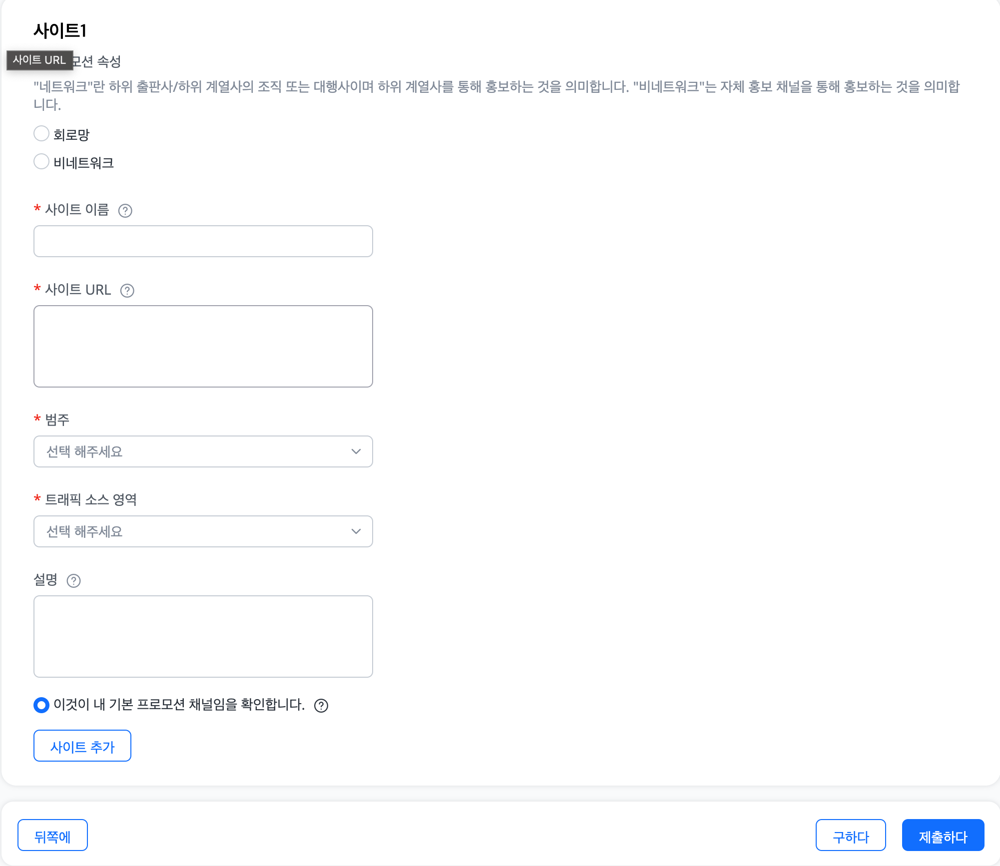 사이트 이름, URL, 범주, 트래픽 소스영역을 선택해서 등록이 가능합니다.