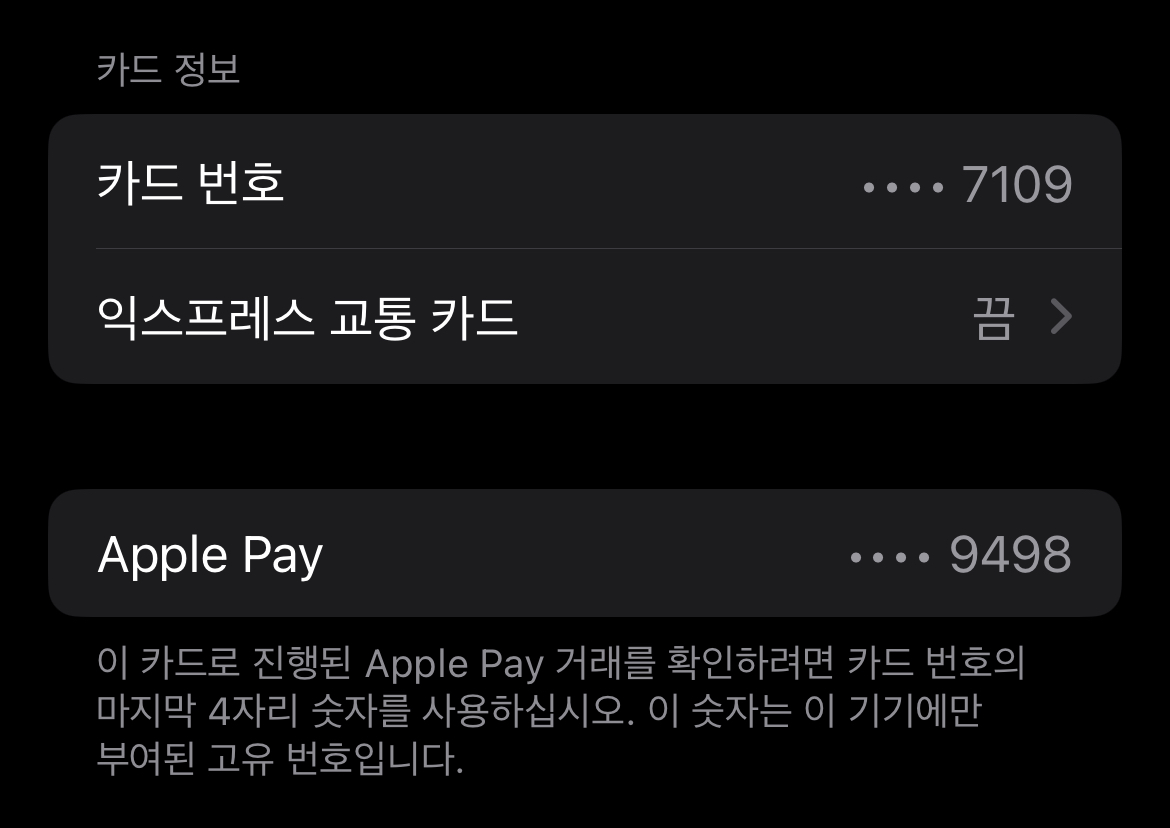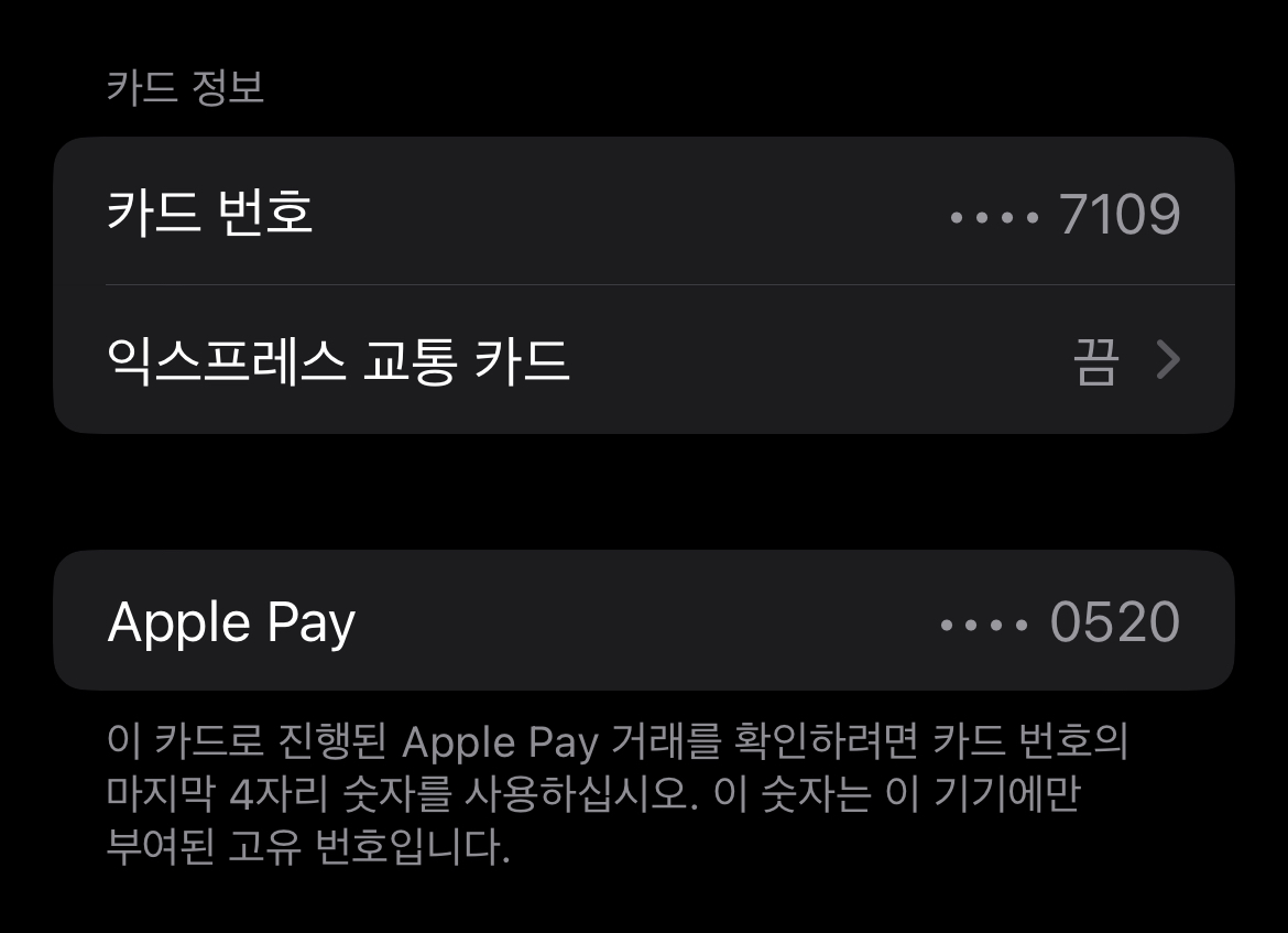 위 사진은 같은 카드를 등록한 아이폰과 애플워치내에 앱내의 카드번호를 확인해보니 서로 다르다는 것을 볼 수 있습니다. 즉 같은 카드라 할 지라도 기기가 다르면 결제취소가 안된다는 점 꼭 기억하시길 바랍니다.