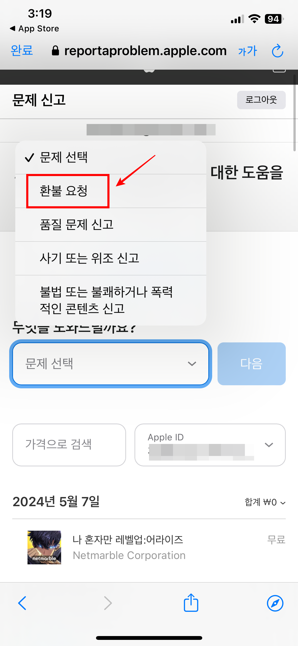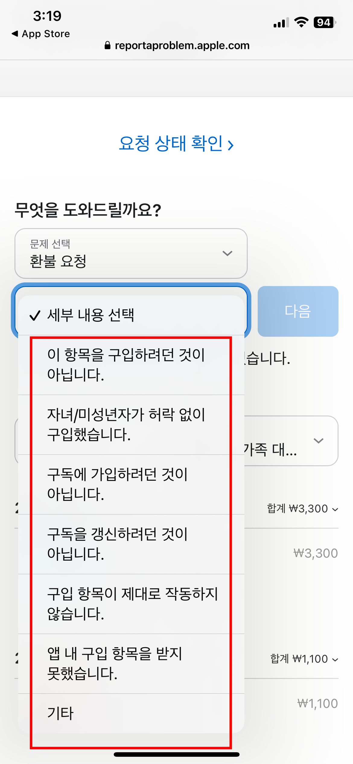 5. 환불 요청하기 시작히기로 콘텐츠와 이유를 선택합니다.