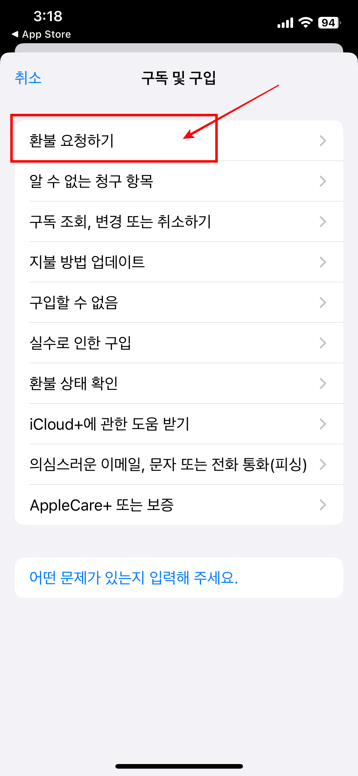 6. 문제 중 환불 요청을 선택합니다.