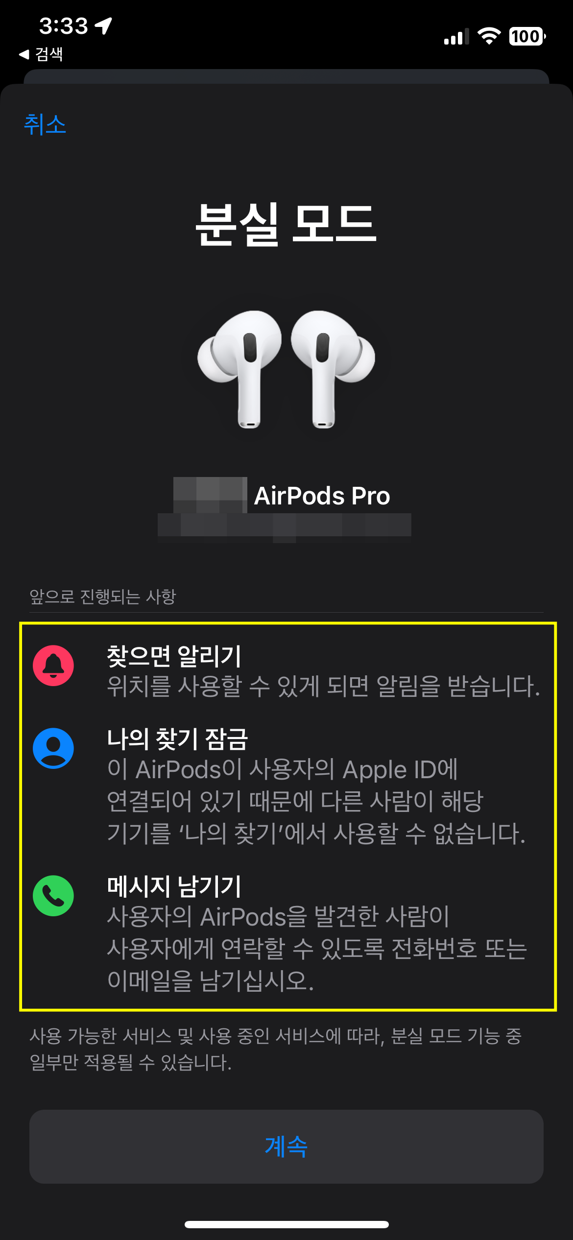이렇게 분실모드를 활성화 하는 것만으로도 그나마 에어팟을 분실했을 때 찾을 수 있는 방법이 되겠습니다. 집이나 근처에서 잃어버렸다면 간단히 사운드 재생을 하는 것만으로도 찾을 수 있지만 분실해서 찾기가 어려운 경우에는 분실모드를 활성화 해서 찾을 수 있게 하는 것이 좋겠습니다.