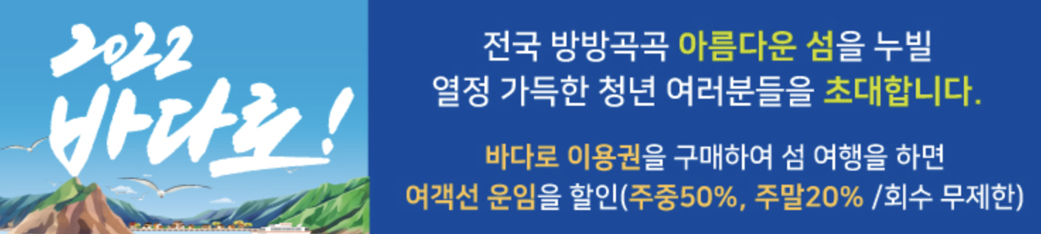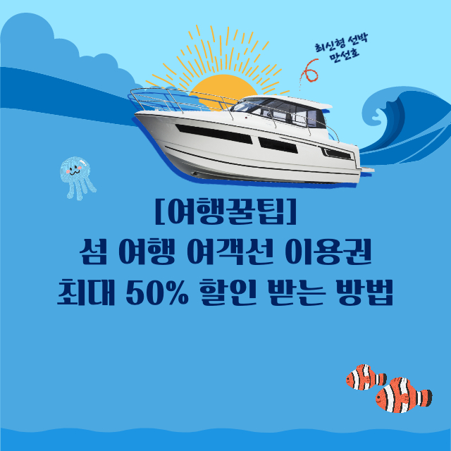여행가기 좋은 날입니다. 특히 요즘 섬으로 여행가고 싶어하시는 분들이 많습니다. 우리나라에 갈만한 섬이 많다는 것을 아시나요? 제주도, 울릉도 이렇게만 생각하기도 하는데 인천, 여수, 통영, 거제, 군산, 목포, 완도, 충남 지역권에도 다양한 섬들이 많이 있고 여객선이 운항중에 있습니다. 그런데 생각보다 여객선 이용권을 최대 50%까지 받을 수 있는 방법이 있습니다. 이런 여행꿀팁 주위에 많이 알려주시고 가족 연인 친구와 함께 계획을 잡아보시길 바랍니다.