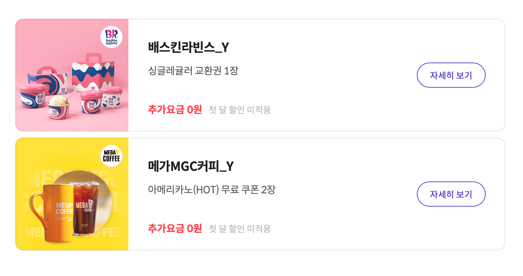 카페/디저트 해택은 베스킨라빈스 싱글레귤러 1장과 메가커피 아메리카노 무료 2잔 입니다. 아이스크림과 커피를 좋아하시는 분들에게는 이만한 해택이 없는 추가 서비스라 할 수 있겠습니다.