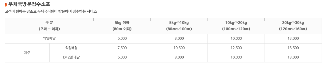우체국 택배 방문접수 비용: 하단 표 참고