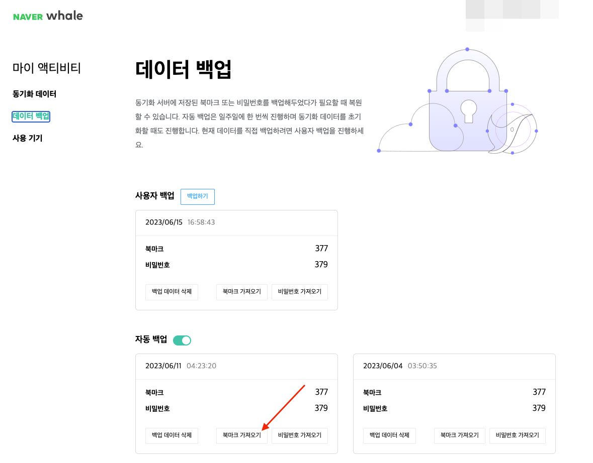 데이터 백업에 들어가면 실시간으로 백업이 된 데이터를 볼 수 있습니다. 자동백업이 활성화가 되어 있으면 일주일에 한번씩 북마크와 비밀번호를 가져오는 것을 볼 수 있습니다. 이때 우리는 북마크 가져오기를 누르게 되면 지워버린 북마크를 복원할 수 있습니다. 그외에도 비밀번호를 가져올 수도 있으니 비번을 삭제하셨더라도 당황하지 마시고 복원할 수 있습니다.