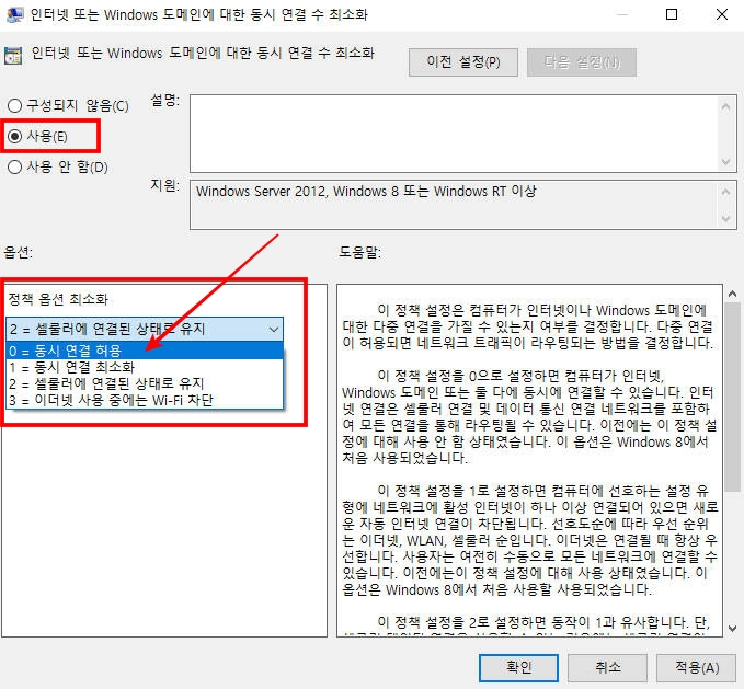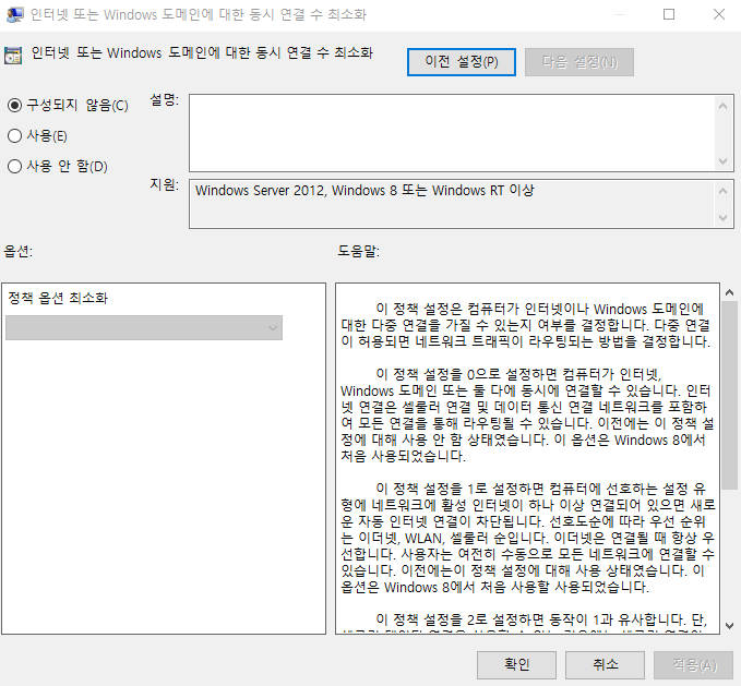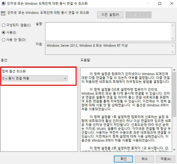 3) windows 연결 관리자에 인터넷 또는 windows 도메인에 대한 동시 연결 수 최소화 설정을 변경합니다.
