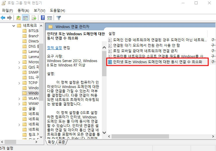 3) windows 연결 관리자에 인터넷 또는 windows 도메인에 대한 동시 연결 수 최소화 설정을 변경합니다.