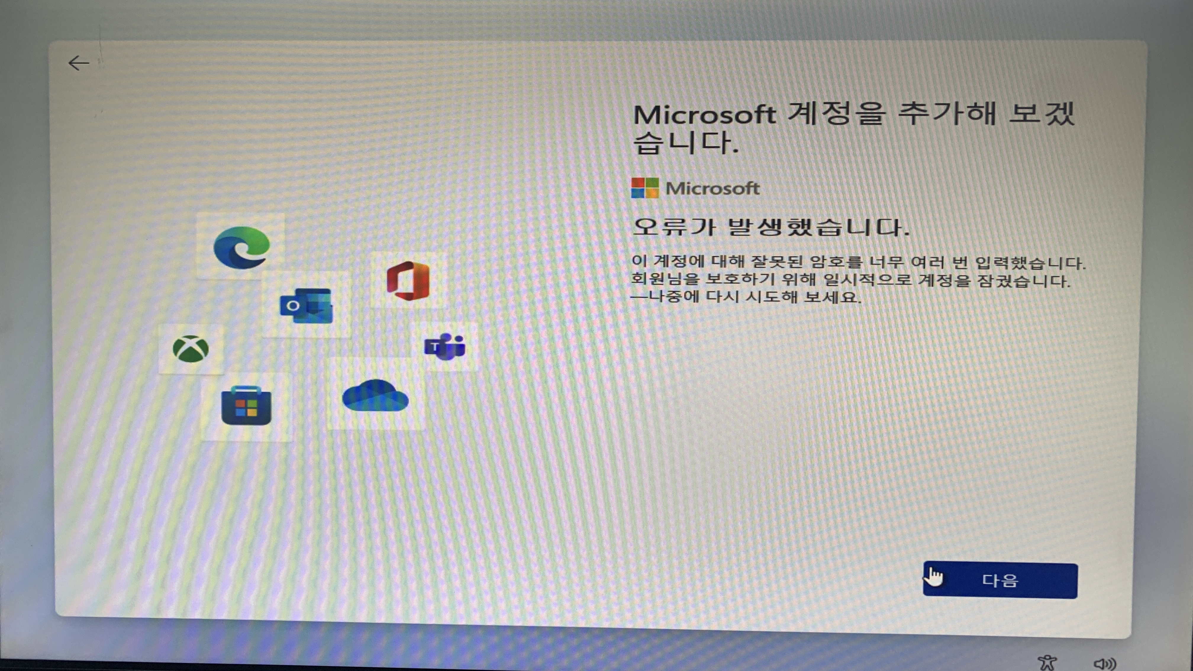 4. 로그인 계정 오류가 발생합니다. 계정 암호를 너무 많이 시도해서 계정이 잠겼다고 합니다. 윈도우11은 너가 가진 계정은 잠겨서 로그인할 수 없으니 나중에 로그인하고 일단 오프라인으로 등록해서 사용할 수 있게 해줍니다.