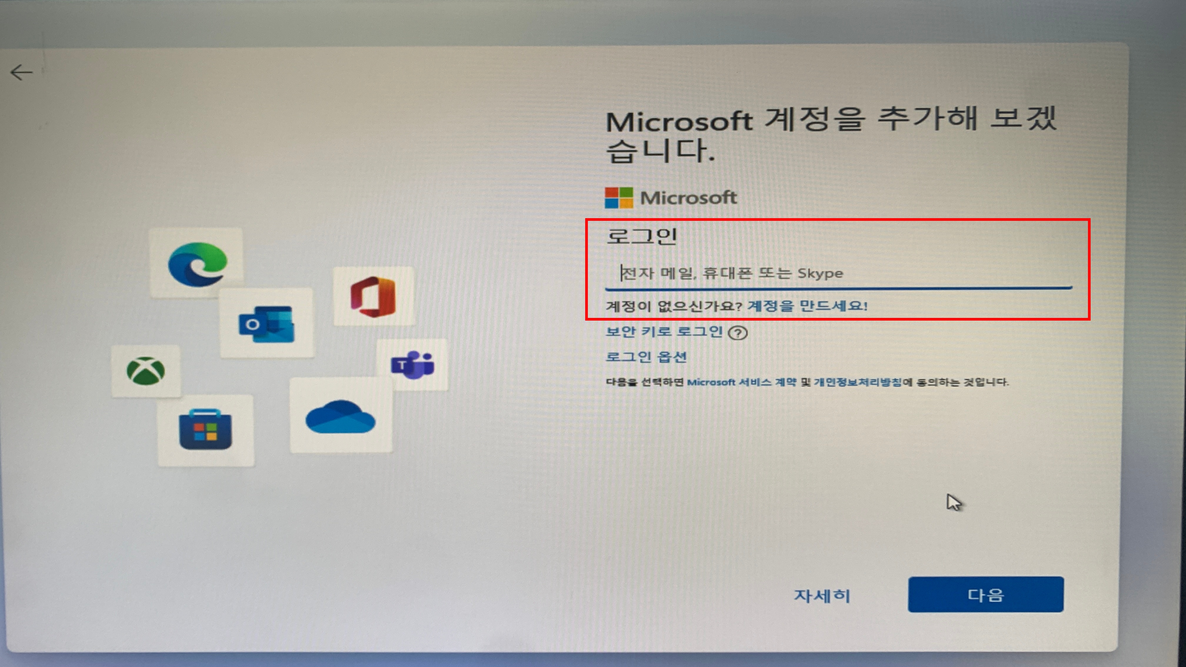 1. 윈도우11 설치화면에서 Microsoft 계정 입력창에서 계정을 입력합니다.