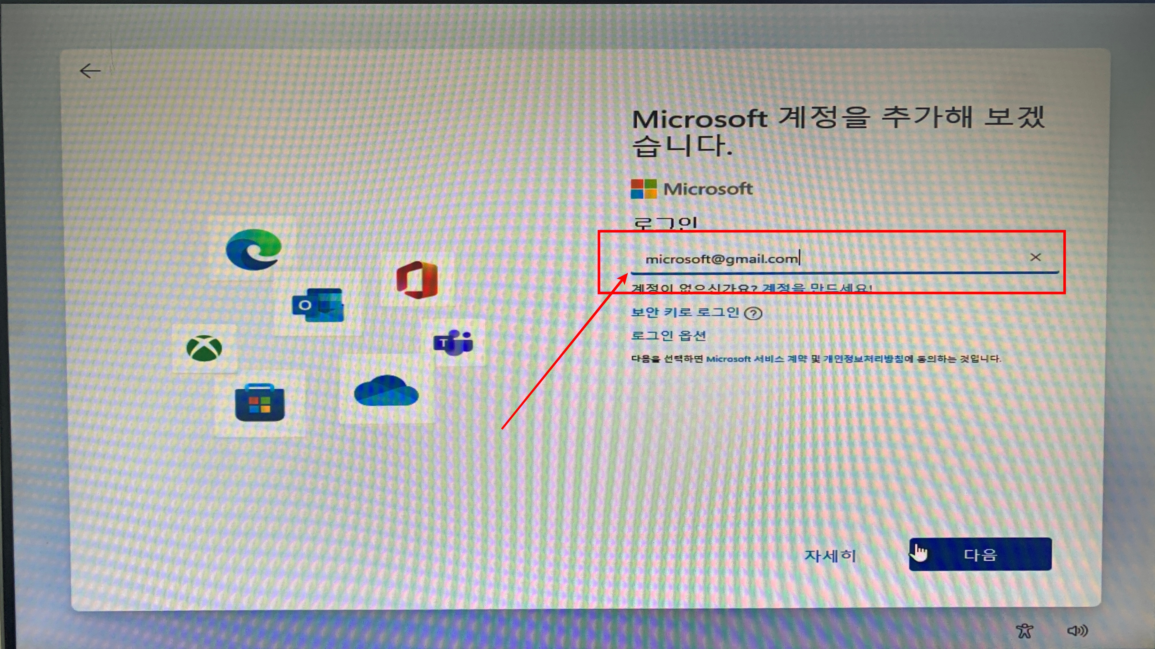 2. microsoft@gmail.com 이렇게 입력합니다. (절대로 로그인이 안될거 같은 계정이죠?)