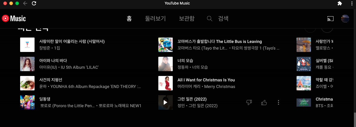 윈도우의 경우는 설치를 하면 바탕화면에 아이콘이 생성이 됩니다. 유튜브 뮤직 PC버전이 실행이 된 모습은 아래와 같습니다. 브라우저를 통해서 접속한 것과 차이는 없습니다. 다만 주소로 들어가는 것이 아니다 모니 뒤로가기나 다른 URL을 클릭하게 되면서  다른 사이트로 넘어가거나 하는 등으로 듣는 음악이 끊기는 경우가 없이 사용이 가능합니다.