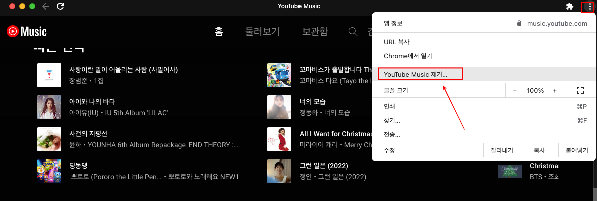 유튜브 뮤직 PC버전을 설치한 상태에서 우측 상단 점 세개를 클릭해서 들어가면 유튜브 뮤직 제거를 바로 확인할 수 있습니다. 크롬에서 설치한 프로그램인 만큼 이렇게 제거를 하는 것이 가장 깔끔하게 제거하는 방법이 되겠습니다.