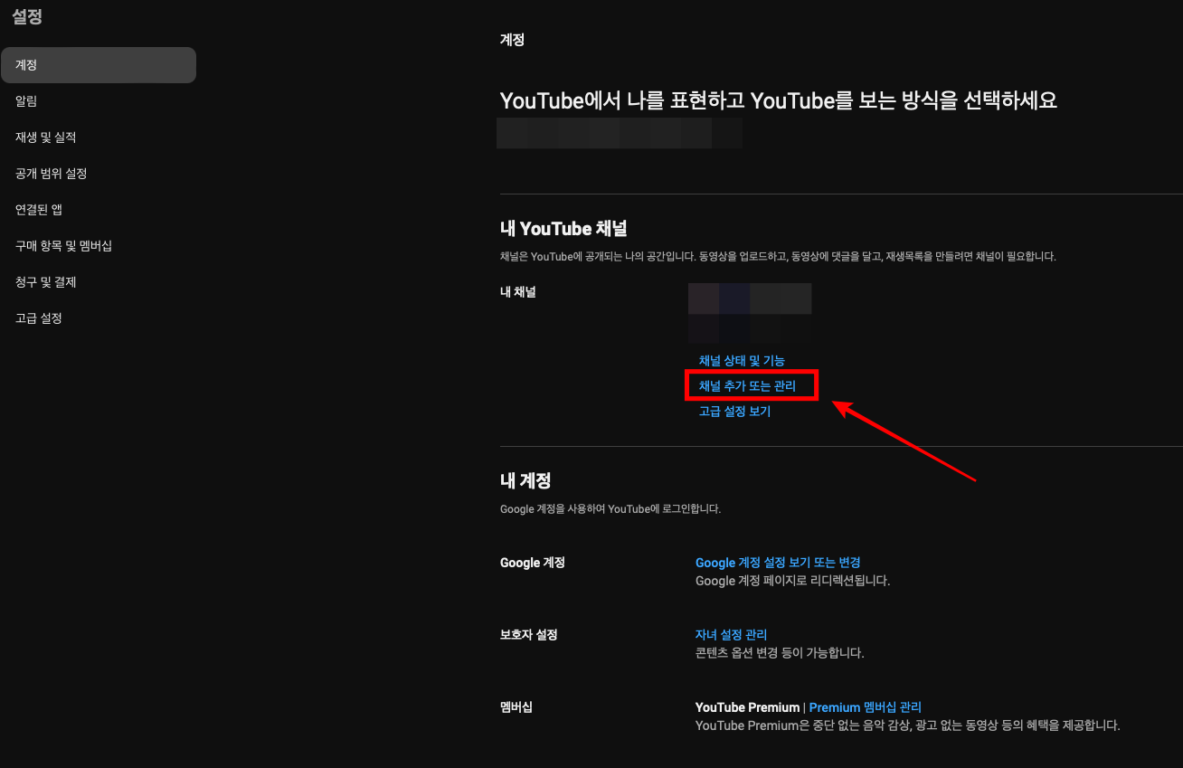 유튜브 프로필 설정에서 내 YouTube 채널 채널 추가 또는 관리로 들어갑니다.