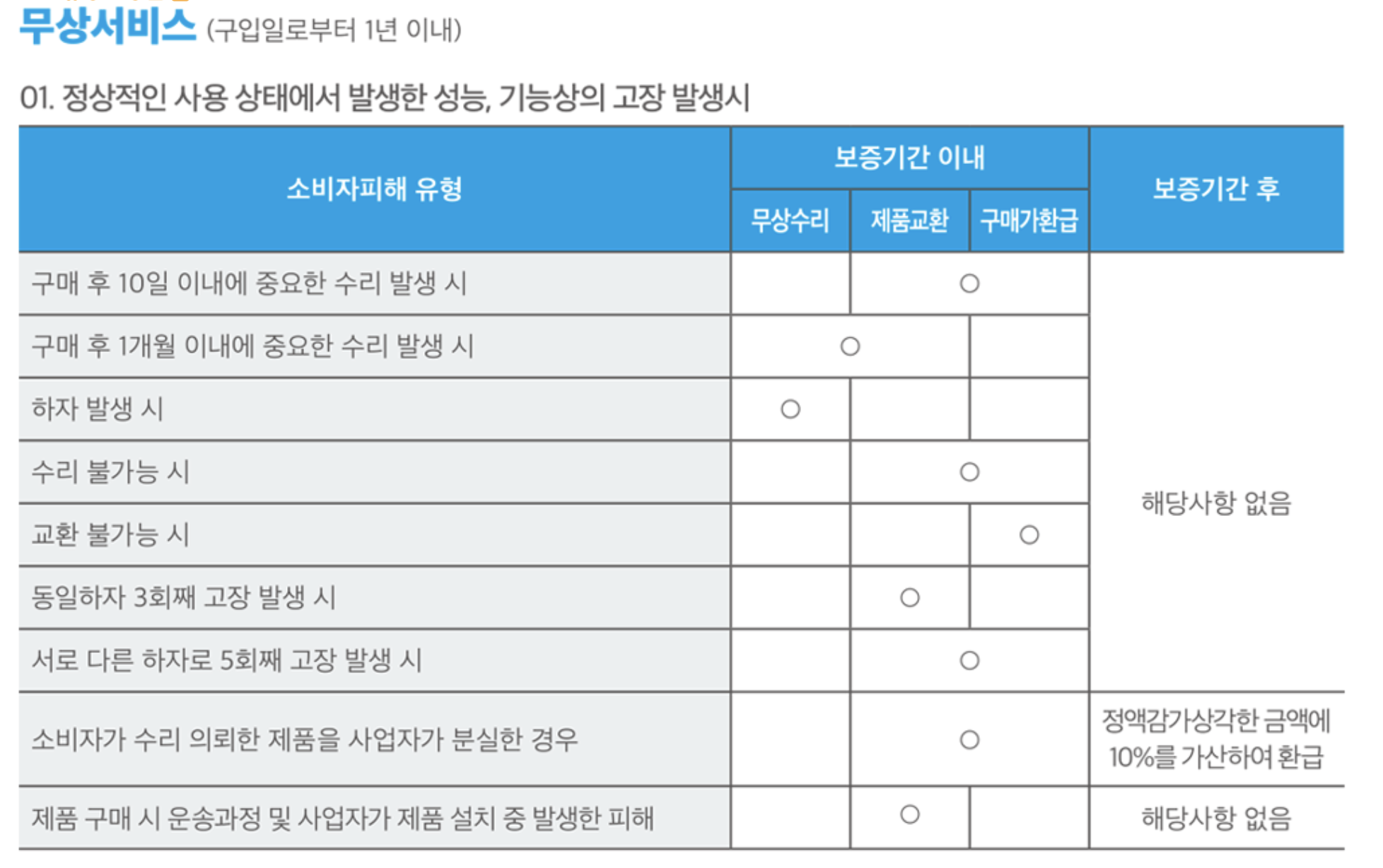 무상 AS를 받기 위해서는 아래와 같은 기준으로 진행하게 됩니다. 아래 표를 참고 하시길 바랍니다.