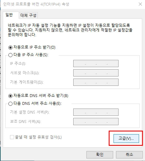 3) 유선 네트워크의 프로토콜 버전 4(TCP/IPV4)의 속성에 들어갑니다. 속성에서 고급으로 들어갑니다. 이때 자동이냐 수동이냐에 따라 달라지긴하는데요. 자동은 하나만 설정하면 되고 수동은 두가지를 설정해야합니다.