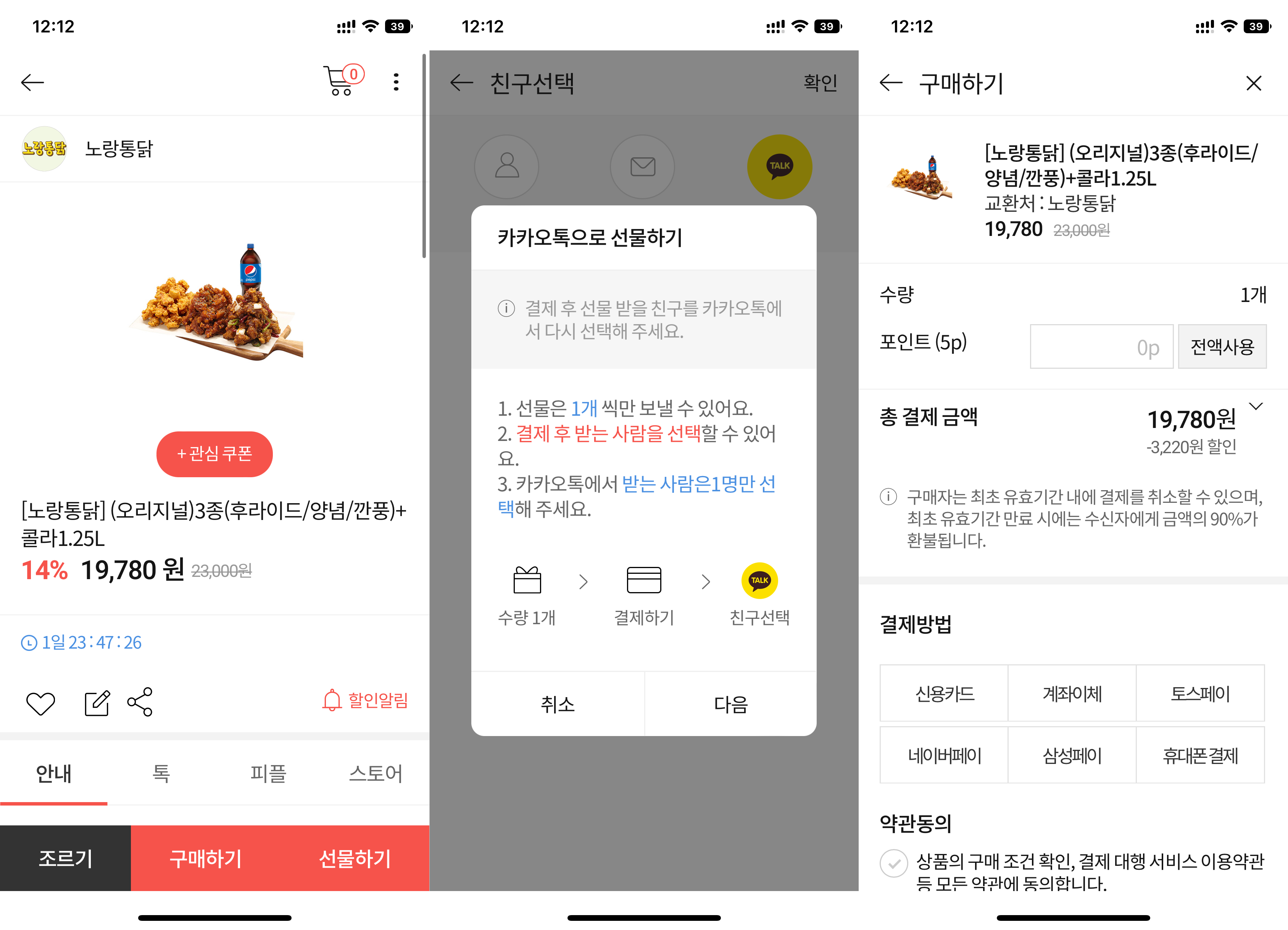 아무리 싸게 구매를 하더라도 카톡 선물하기가 불편하면 쓰기가 쉽지가 않은데요. 구매하는 방식은 간편합니다. 원하는 선물은 선택해서 결제를 할 수 있으며 카톡에서 선택하면 선물하기를 보낼 수 있습니다. 여기서 받는 사람이 따로 일상카페 어플을 설치하지 않았더라도 똑같이 기프티콘을 간편하게 사용할 수 있습니다.