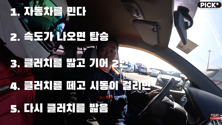 수동 차량은 차량을 민 가속도를 이용해서 기어를 넣으면 그 힘을 이용해서 강제로 엔징 시동을 거는 방법입니다. 대신 기어를 1단으로 넣는 것보다는 2단을 넣는 것이 좀더 부드럽게 시동을 걸 수 있습니다. 만약 좀 더 원할하게 시동을 걸기 위해서는 두명이 있다면 한명이 밀고 한명이 시동을 걸면 수월하게 시동을 걸 수 있습니다. 혼자 있다면 만약 여유로운 공간이 있다면 살짝 내리막길에서 시동을 거는 것도 하나의 방법이 될 수 있습니다.