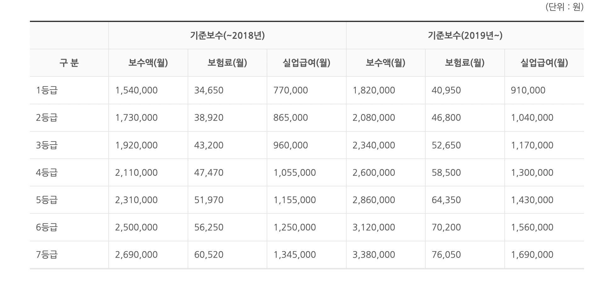 자영업자의 고용보험료는 불규칙한 자영업자의 수익을 고용노동부 장관이 고시하는 기준보수에서 선택이 됩니다. 기준보수는 2016년 이후 7등급으로 구분이 됩니다.