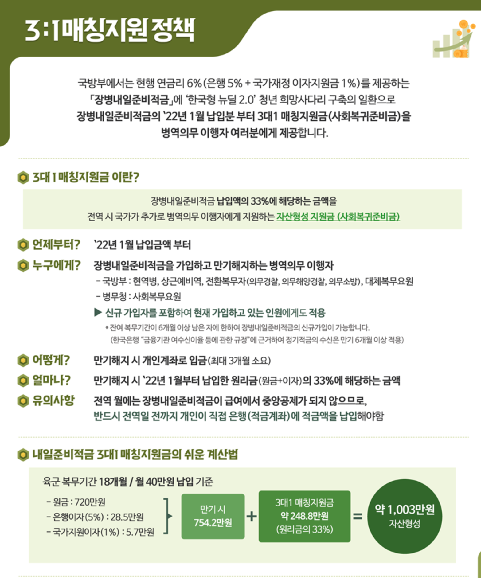 장병내일준비적금 3대 1 매칭 지원정책이란 납입액의 33%를 전역시 추가로 지원하는 것입니다. 주의해야할 점은 중도해지를 하면 안되고 만기해지를 해야 받을 수 있습니다. 주의사항으로는 전역하는 달에는 급여에서 중앙공제가 되지 않기 떄문에 반드시 전역일 전에 개인이 직접 적금액을 납입해야 만기로 해택을 받을 수 있습니다.