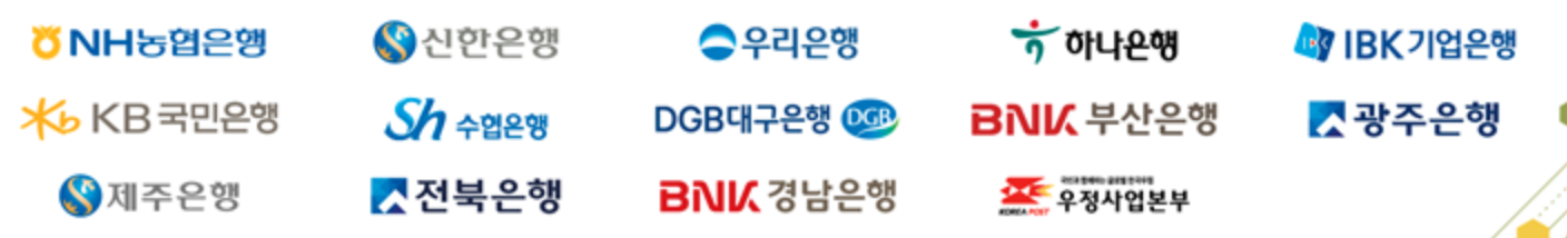 (NH농협, 신한, 우리, 하나, 기업, KB국민, 수협, 대구, 부산, 광주, 제주, 전북, 경남, 우체국)