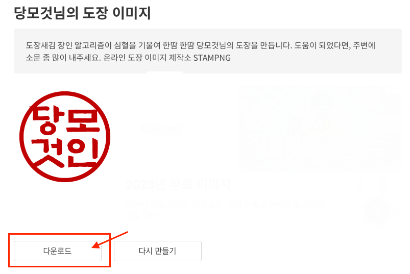 이렇게 모든 옵션을 선택한 뒤에 도장 이미지 만들기를 누르시면 1분도 안되어서 도장 이미지 무료 다운로드가 가능합니다. 이렇게 만들어진 도장 이미지를 다운로드 하면 쉽게 저장이 가능합니다.