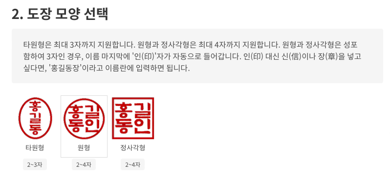 2. 도장 모양을 선택합니다. 도장 모양은 타원형, 원형, 정사각형이 있으며 타원은 3자까지만 지원합니다. 원형과 정사각형의 경우 4자까지 입력이 가능합니다.