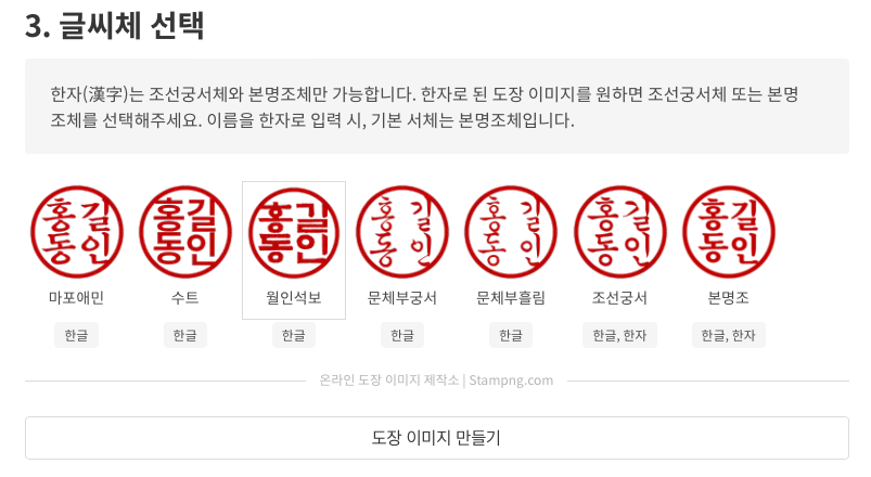 도장 이미지를 만드는데 프로그램도 필요없습니다. 바로 아래 사이트에 접속하여 이름과 모양, 글씨체만 선택하면 아주 쉽게 이미지를 만들수 있습니다.