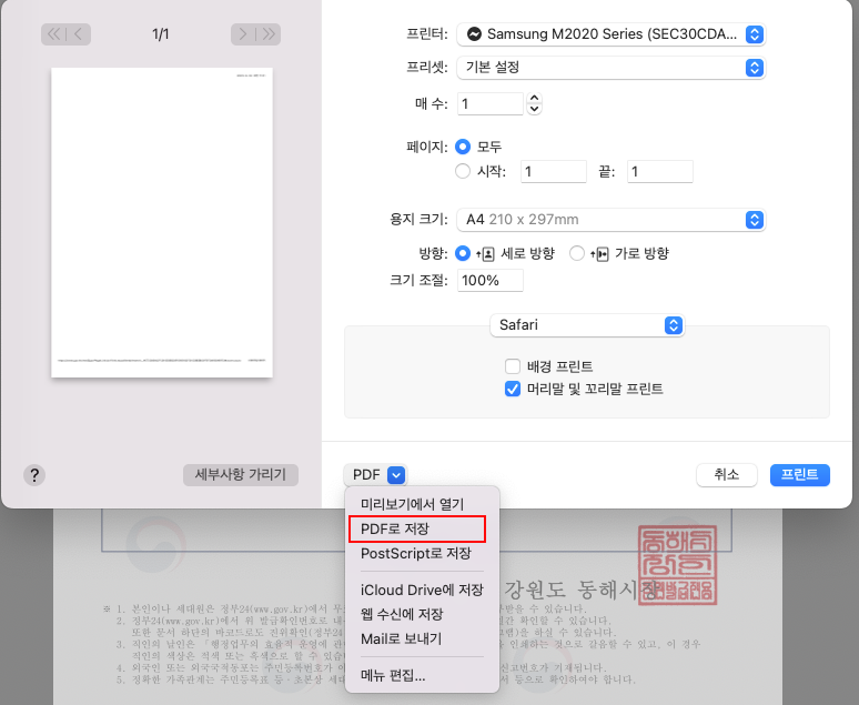 주민등록등본을 PDF 파일로 저장하기 위해서는 프린터 출력을 누르게 되면 PDF 파일 저장을 누르시면 파일로 저장이 가능합니다. 지금 아래는 맥북 화면이지만 윈도우상에서도 프린터 출력 옵션에서 PDF로 저장을 하시면 쉽게 저장이 가능합니다. 이렇게 PDF 저장을 하시면 네트워크 프린터를 이용하는 PC방에서도 출력이 가능해집니다.