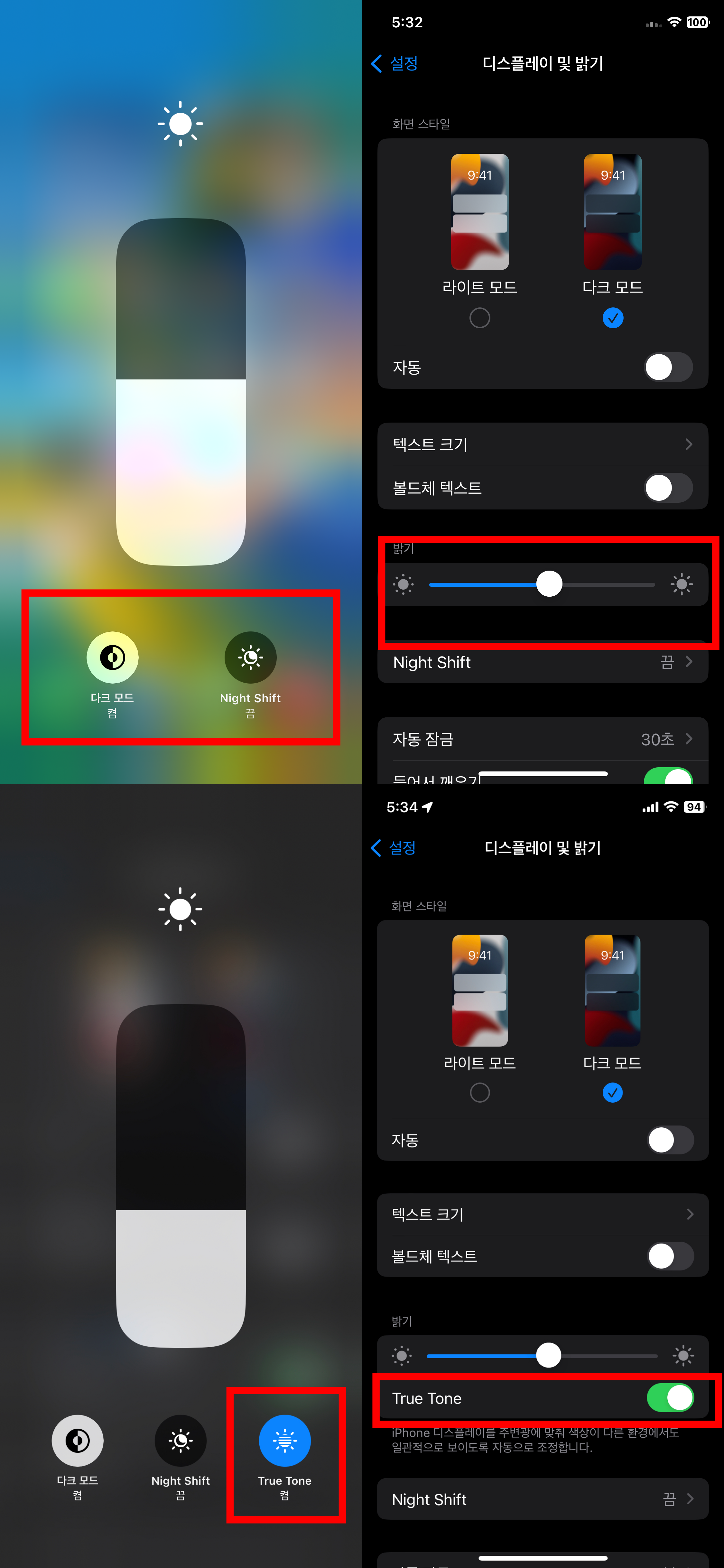 디스플레이의 경우 트루톤 지원 여부를 볼 수 있습니다. 물론 최근에는 사설업체에서 트루톤 값을 복사해서 옮겨주기 때문에 이렇게까지 진행이 됐다면 바로 확인하기 어려운 부분도 있지만 자가교체를 했거나 했다면 트루톤 설정이 되지 않습니다. 확인방법은 오른쪽 제어센터를 내리고 화면 밝기를 꾹 누르면 차이가 보입니다. 설정에서 디스플레이 밝기에서 밝기 컨트롤러 아래를 확인하면 아래 이미지와 같이 트루톤 활성화 비활성화를 확인할 수 있습니다.
