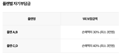 손해액의 자기 부담금이 있습니다. 플랜별로 자기 부담금의 비용이 다릅니다. 플랜 A, B는 손해액 30%(최소 3만 원)이며, 플랜 C, D는 손해액의 40%(최소 3만 원)의 자기 부담금이 있으니 참고하시길 바랍니다.