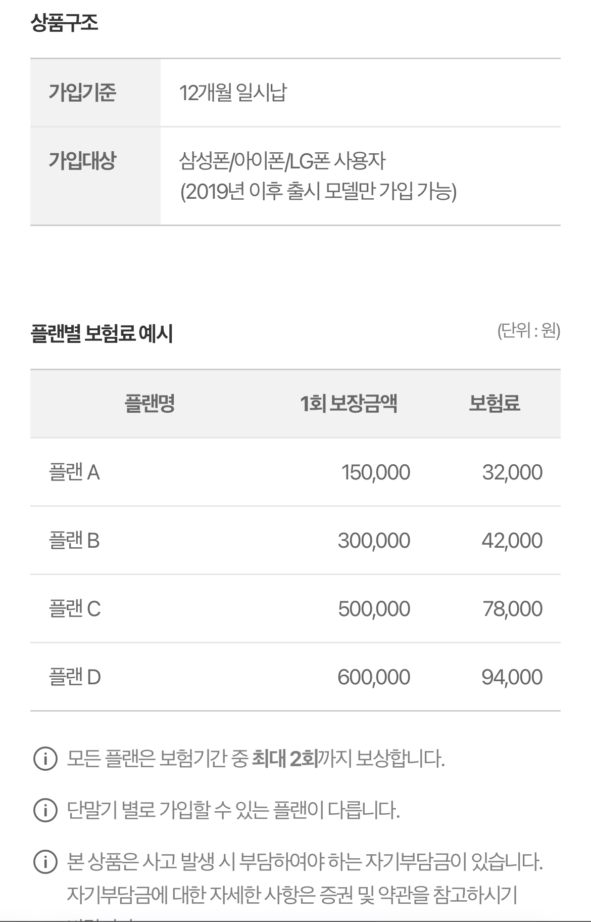 캐롯 폰케어 액정안심보험 비용- 1년 보험료 일시납부- 플랜A: 32,000원- 플랜B: 42,000원- 플랜C: 78,000원- 플랜D: 94,000원