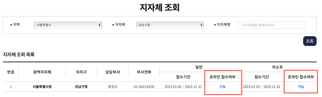 담당부서 지자체를 검색하면 연락처는 물론 접수가 가능한지 예산이 남아 있는지 확인도 가능합니다.