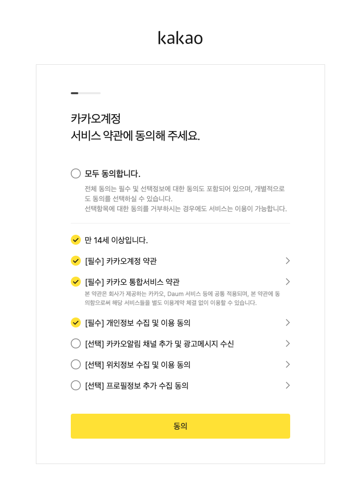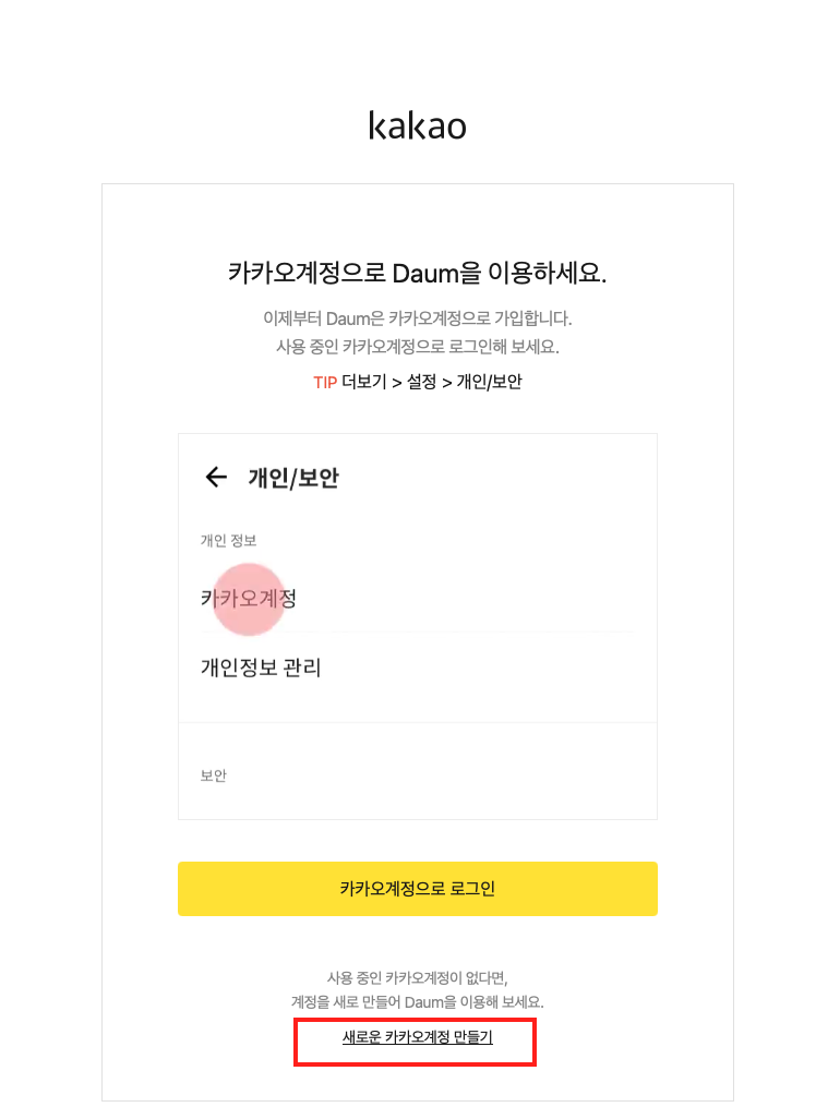 카카오 로그인 페이지에 접속 후 회원가입을 누르면 새로운 카카오 계정 만들기를 눌러서 가입을 진행합니다.