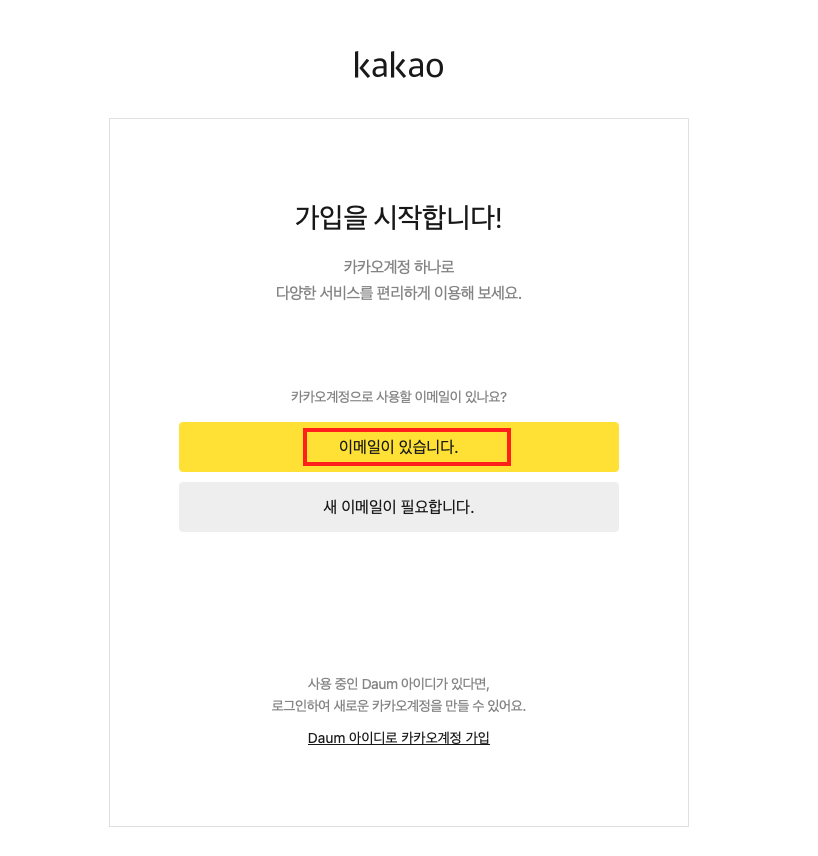 이때 이메일이 있습니다를 선택해서 기존에 가지고 있는 이메일로 가입을 합니다. 이때 주의해야할 점은 카카오 메일이 아닌 네이버나 구글 계정으로 가입을 하는 것이 좋아서 추천 드립니다.